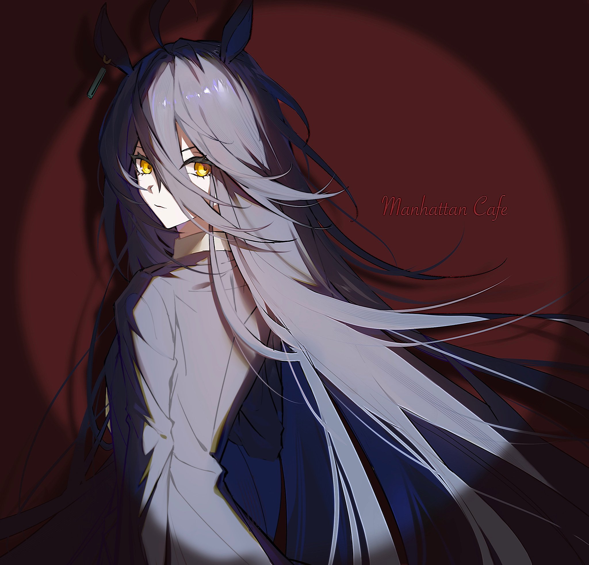 1girl ahoge animal_ears black_coat black_hair character_name closed_mouth coat earrings hair_between_eyes highres horse_ears jewelry long_hair long_sleeves looking_at_viewer looking_back manhattan_cafe_(umamusume) ninaki999 red_background searchlight shadow single_earring solo spotlight umamusume upper_body v-shaped_eyebrows very_long_hair yellow_eyes