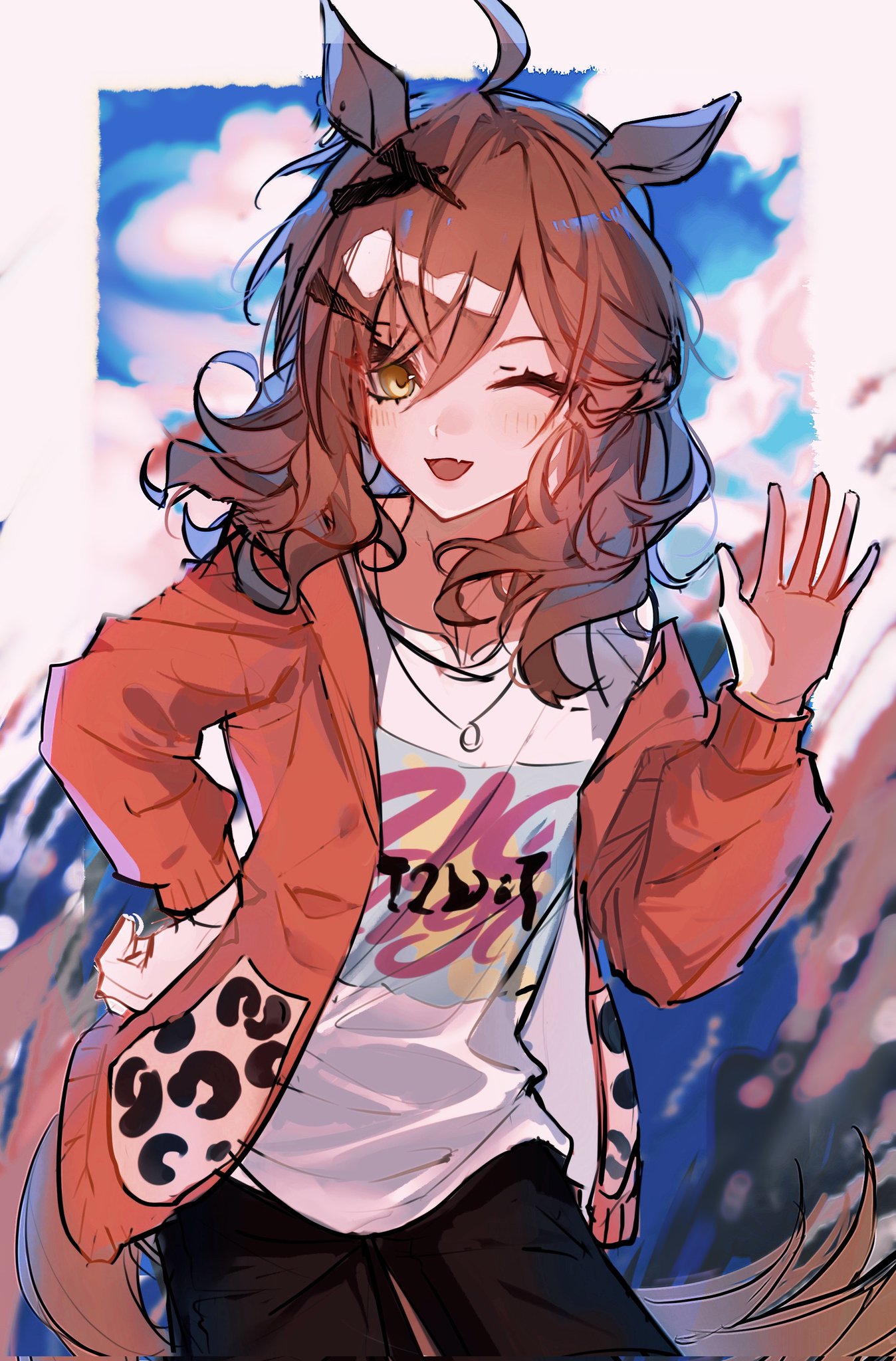 1girl ahoge animal_ears black_pants blush brown_hair corrupted_twitter_file fang hand_on_own_hip hand_up highres horse_ears horse_girl horse_tail jacket jewelry jungle_pocket_(umamusume) long_hair long_sleeves necklace ninaki999 one_eye_closed open_clothes open_jacket open_mouth orange_jacket pants ring ring_necklace shirt skin_fang smile solo tail umamusume unfinished waving white_shirt yellow_eyes