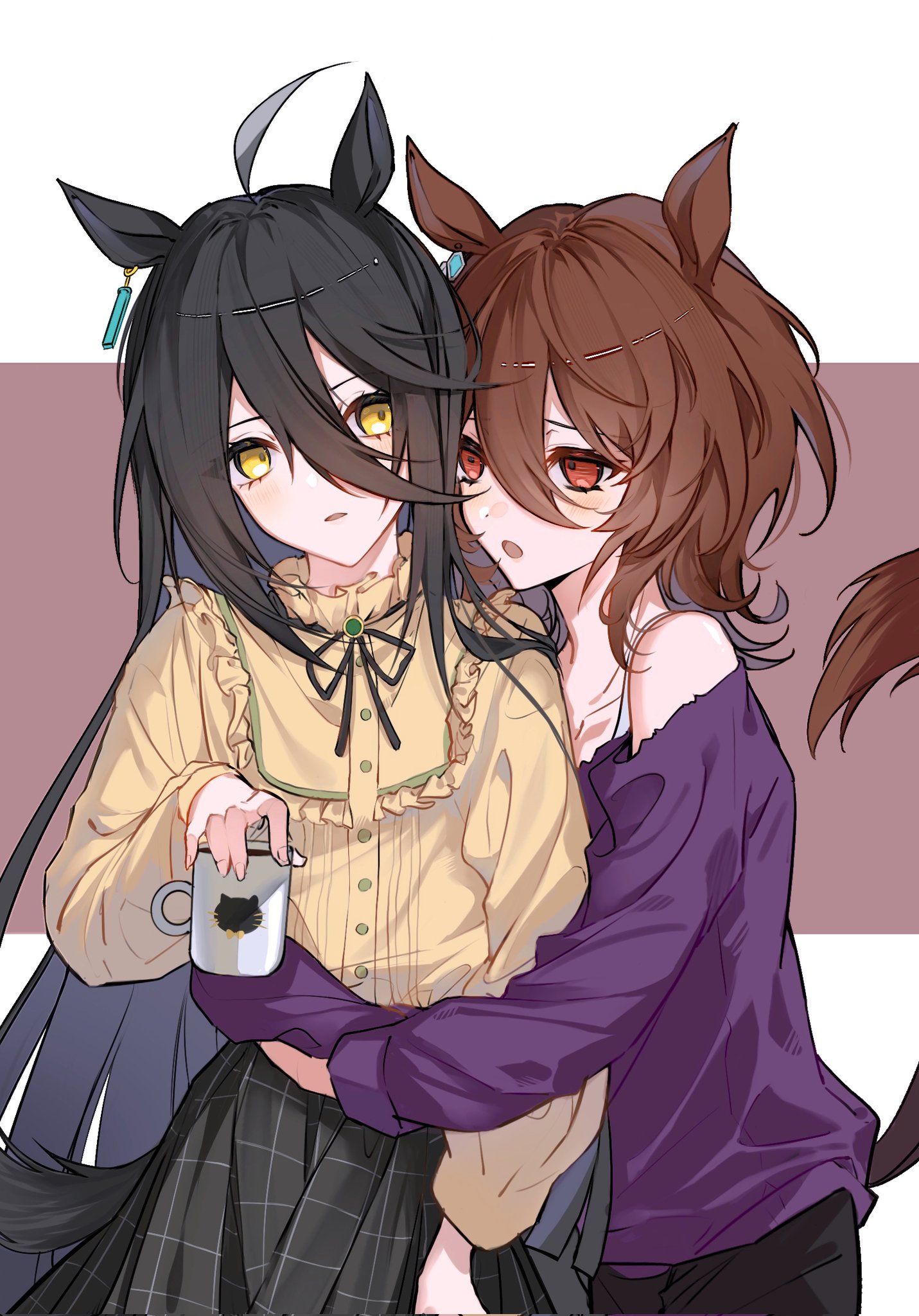 2girls agnes_tachyon_(casual)_(umamusume) agnes_tachyon_(umamusume) ahoge animal_ears bare_shoulders black_hair black_pants black_skirt blush brown_hair corrupted_twitter_file cup earrings frilled_shirt_collar frills hair_between_eyes highres holding holding_cup horse_ears horse_girl horse_tail hug jewelry long_hair long_sleeves manhattan_cafe_(umamusume) medium_hair multiple_girls neck_ribbon ninaki999 off-shoulder_shirt off_shoulder open_mouth pants purple_shirt raised_eyebrows red_eyes ribbon shirt single_earring skirt tail umamusume upper_body yellow_eyes yellow_shirt yuri