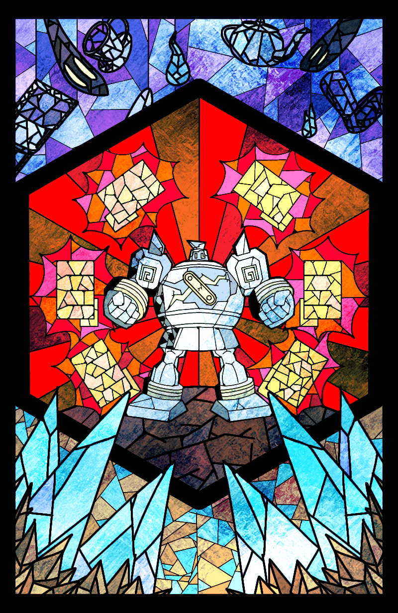1other black_border blue_gem border clenched_hands cup free_butterfree full_body gem gen_5_pokemon ghost golem golurk highres looking_at_viewer nintendo other_focus pokemon pokemon_(creature) saucer solo stained_glass standing straight-on sunburst sunburst_background teacup teapot yellow_eyes