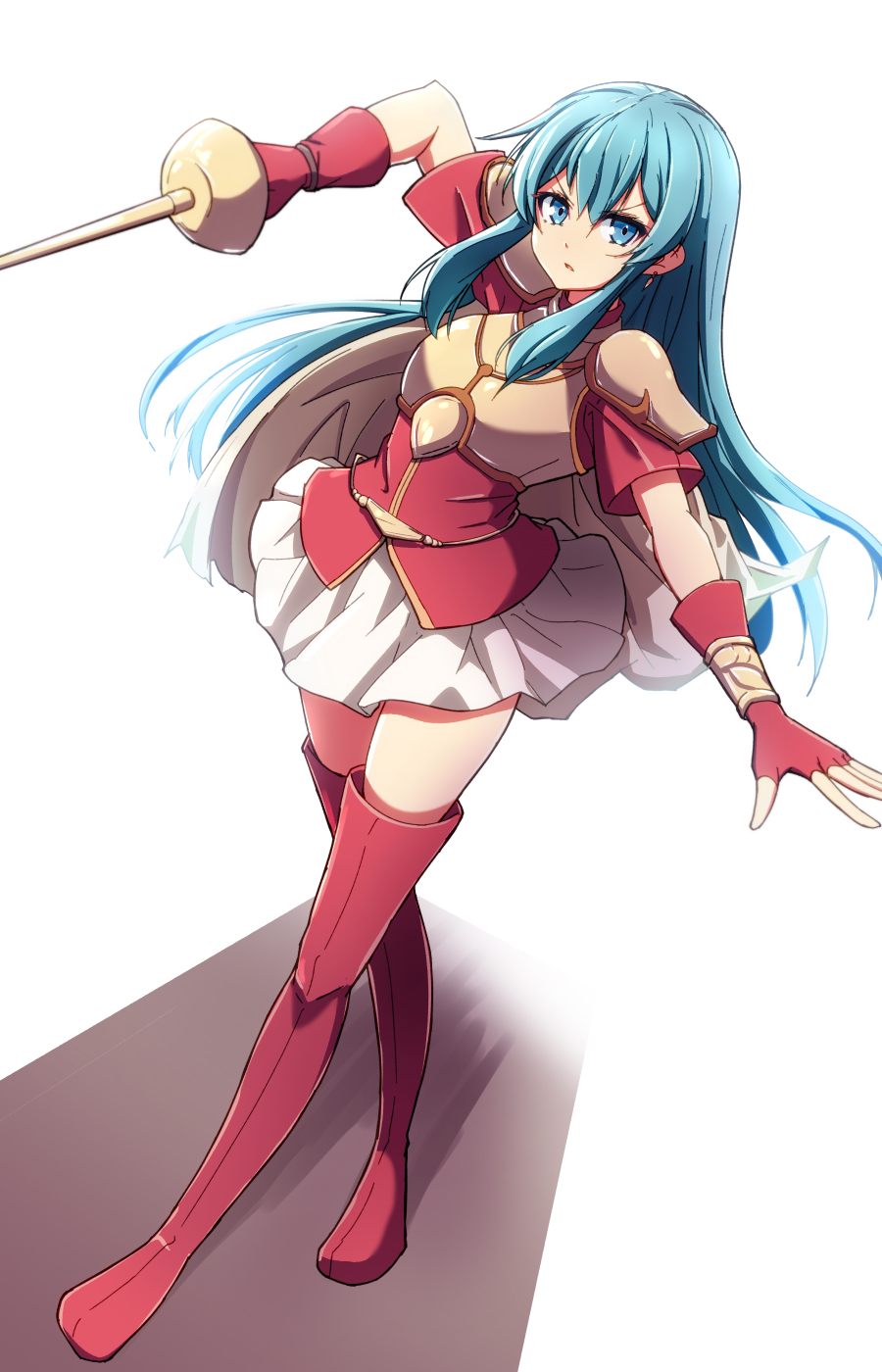 1girl aqua_eyes aqua_hair armor boots bracelet breastplate earrings eirika_(fire_emblem) fingerless_gloves fire_emblem fire_emblem:_the_sacred_stones full_body gloves hair_between_eyes highres holding holding_sword holding_weapon jewelry long_hair looking_at_viewer minamonochaba nintendo parted_lips red_boots red_gloves red_shirt shirt shoulder_armor sidelocks skirt solo sword thigh_boots weapon white_background white_skirt