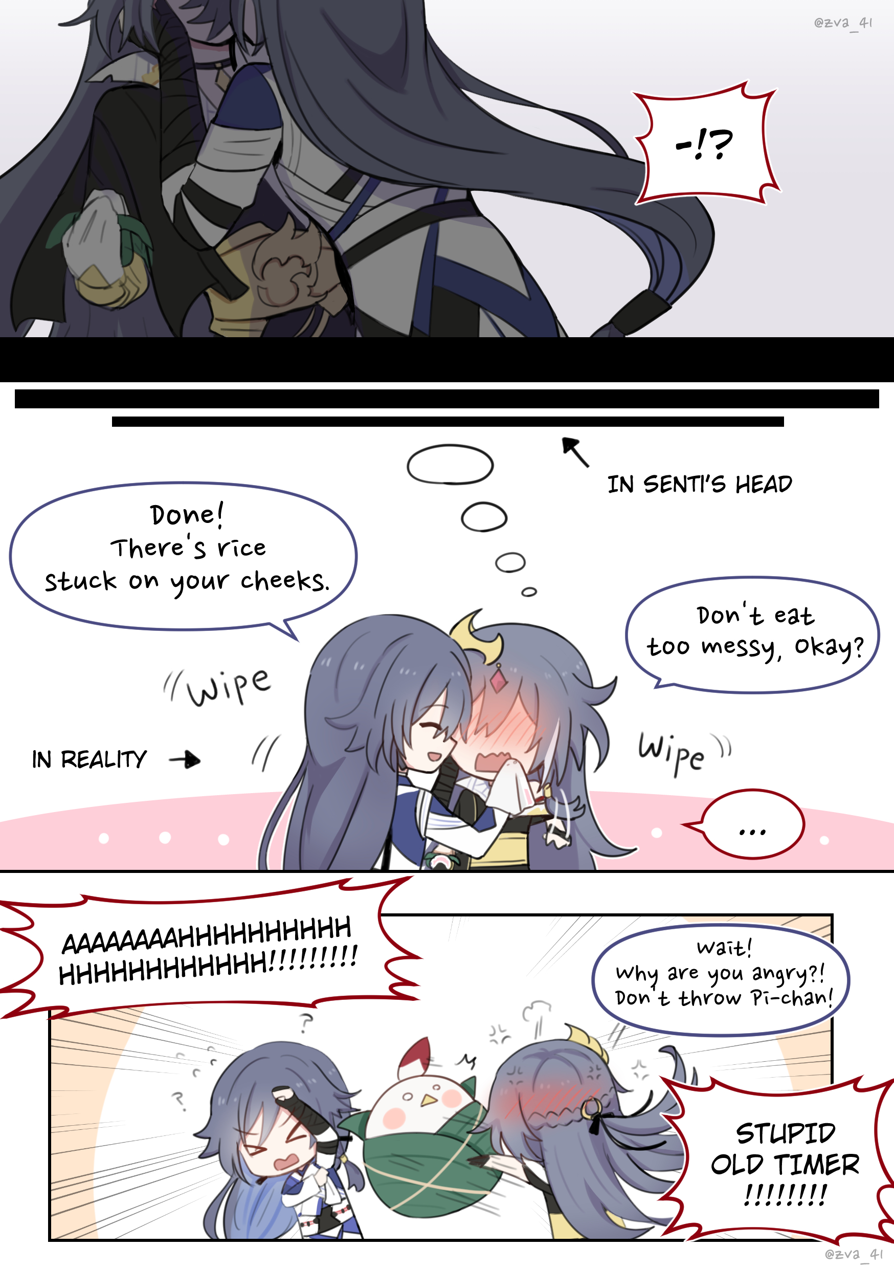 !? 2girls absurdres alternate_costume angry asymmetrical_clothes black_gloves blue_eyes blue_hair blush chinese_clothes english_text eyeliner fingerless_gloves flannel fu_hua fu_hua_(azure_empyrea) herrscher_of_sentience fu_hua_(taixuan_impression) gloves grey_hair hair_between_eyes hanfu highres honkai_(series) honkai_impact_3rd imagining jewelry jingwei_(bird) long_hair makeup misunderstanding multicolored_hair multiple_girls official_alternate_costume on_head red_eyeliner red_eyes single_bare_shoulder single_glove speech_bubble streaked_hair white_hair yellow_pupils zva_41