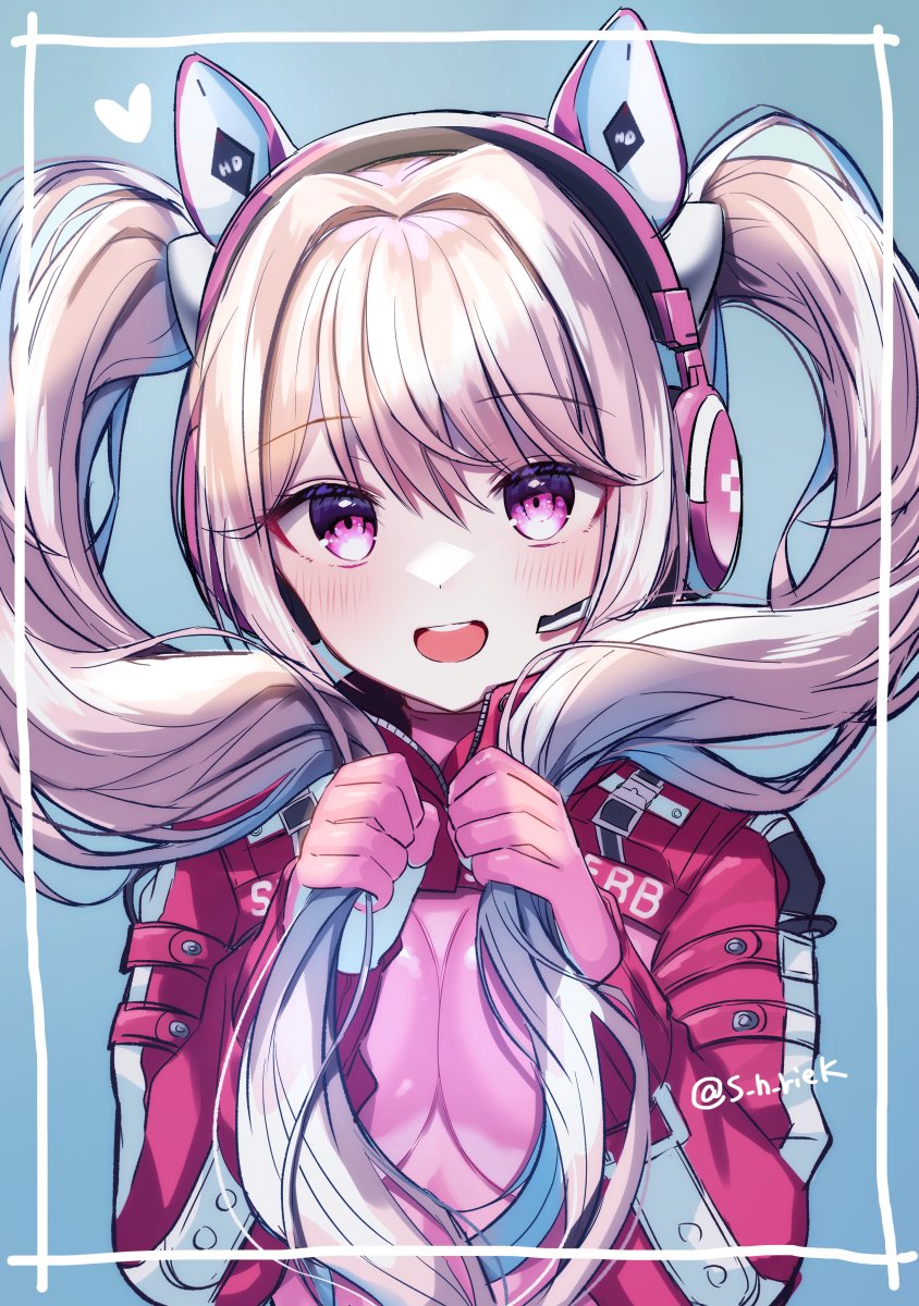 1girl :d alice_(nikke) animal_ear_headphones animal_ears blush bodysuit breasts cropped_jacket fake_animal_ears goddess_of_victory:_nikke grey_hair hair_intakes headphones heart highres holding holding_own_hair jacket latex latex_bodysuit long_hair medium_breasts open_mouth pink_bodysuit pink_eyes red_jacket s_h_riek smile solo twintails twitter_username upper_body