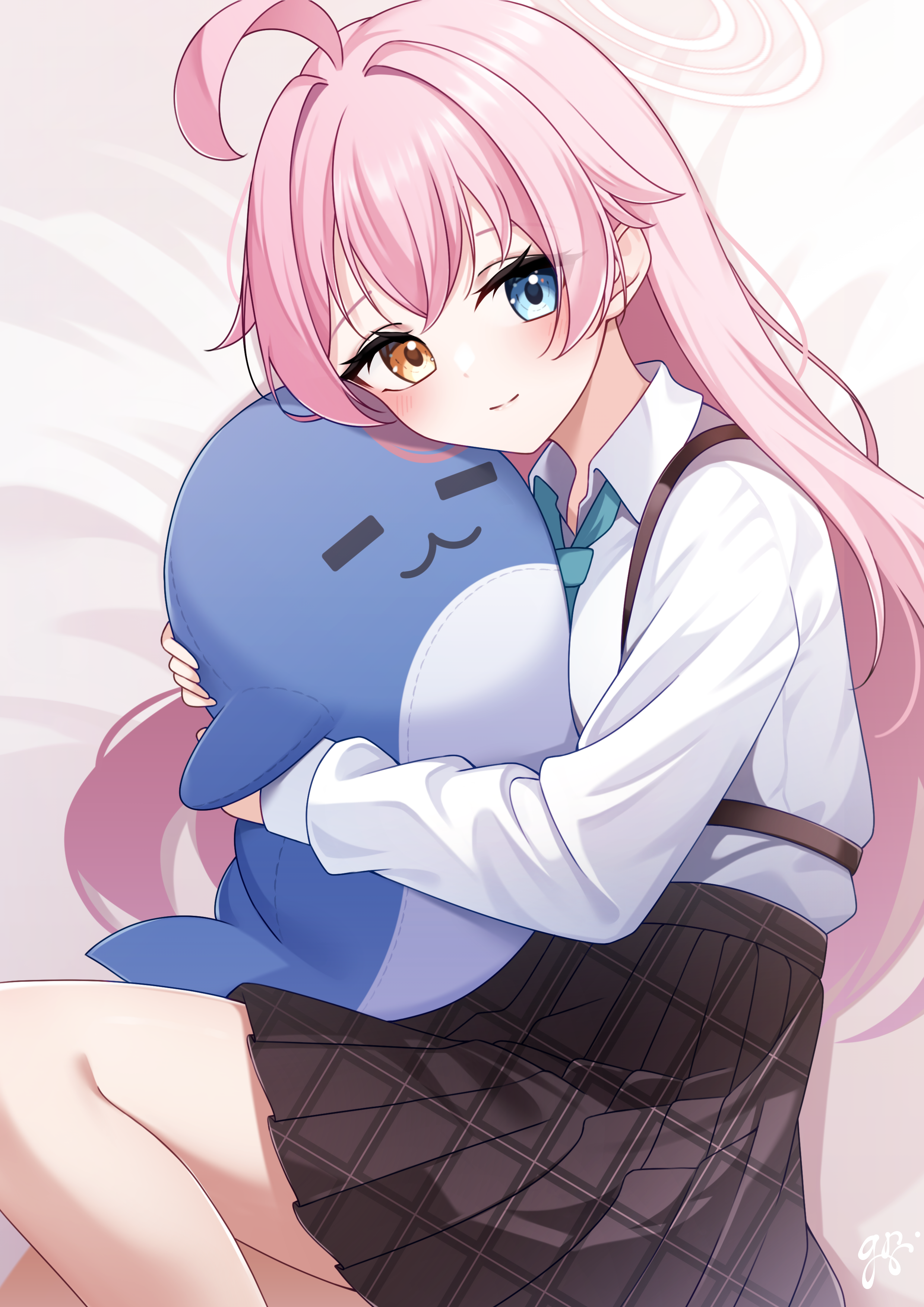 1girl absurdres blue_archive blue_eyes guri_(gri1211) highres hoshino_(blue_archive) long_hair long_sleeves lying pink_hair solo yellow_eyes
