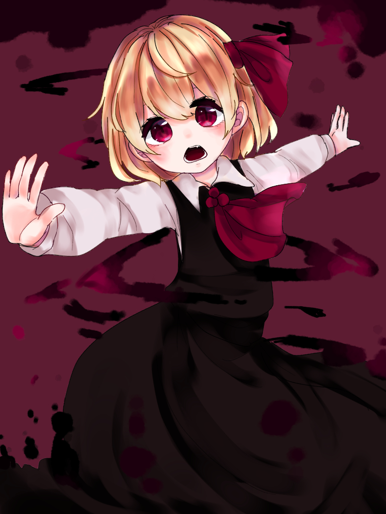 1girl ascot black_skirt black_vest blonde_hair bow collared_shirt cowboy_shot hair_between_eyes hair_bow head_tilt kuromame1025 long_sleeves looking_at_viewer open_mouth red_ascot red_background red_bow red_eyes rumia shirt simple_background skirt skirt_set solo t-pose teeth touhou vest white_shirt