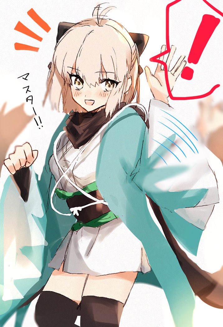 ! 1girl :d ahoge black_scarf black_thighhighs blonde_hair blush cowboy_shot fate/grand_order fate_(series) haori japanese_clothes kimono looking_at_viewer notice_lines obi okita_souji_(fate) okita_souji_(koha-ace) okita_souji_(third_ascension)_(fate) open_mouth sash scarf shiho_(shihoteifujo) short_kimono simple_background sketch smile solo spoken_exclamation_mark thighhighs waving white_background white_kimono yellow_eyes