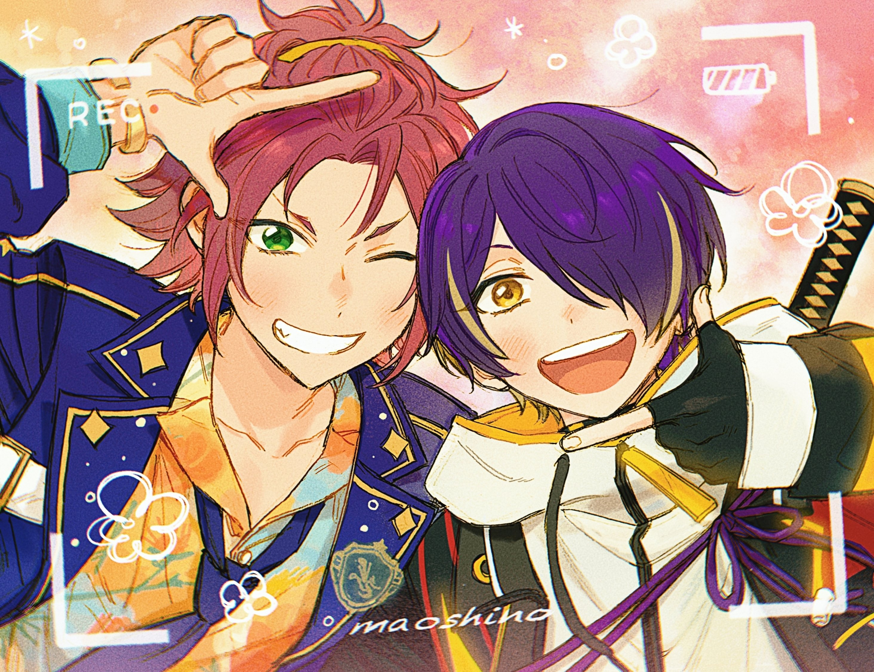 250peicai 2boys blazer blonde_hair blue_jacket ensemble_stars! green_eyes highres hood hood_down isara_mao jacket multicolored_hair multiple_boys one_eye_closed open_mouth orange_eyes purple_hair recording red_hair sengoku_shinobu pairing_name smile teeth white_jacket