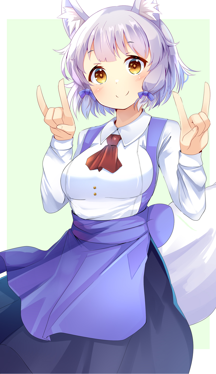 1girl animal_ear_fluff animal_ears apron aru_(arudes) ascot black_skirt blue_apron blue_bow blunt_bangs blush border bow breasts c: closed_mouth collared_shirt commentary_request cowboy_shot double_fox_shadow_puppet fox_ears fox_girl fox_shadow_puppet fox_tail green_background grey_hair hair_bow hands_up highres long_sleeves looking_at_viewer machikado_mazoku medium_breasts red_ascot riko_(machikado_mazoku) shirt short_hair simple_background skirt smile solo split_mouth standing suspenders tail tareme white_border white_shirt yellow_eyes