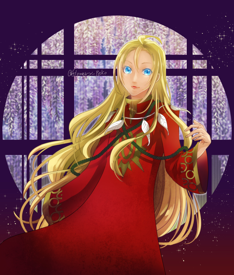 1boy ahat_(ragnarok_online) ahoge bishounen blonde_hair blue_eyes commentary_request cowboy_shot feathers flower flowery_peko hair_between_eyes long_hair long_sleeves looking_at_viewer male_focus open_mouth purple_background purple_flower ragnarok_online red_robe robe smile solo sparkle twitter_username very_long_hair wide_sleeves wisteria