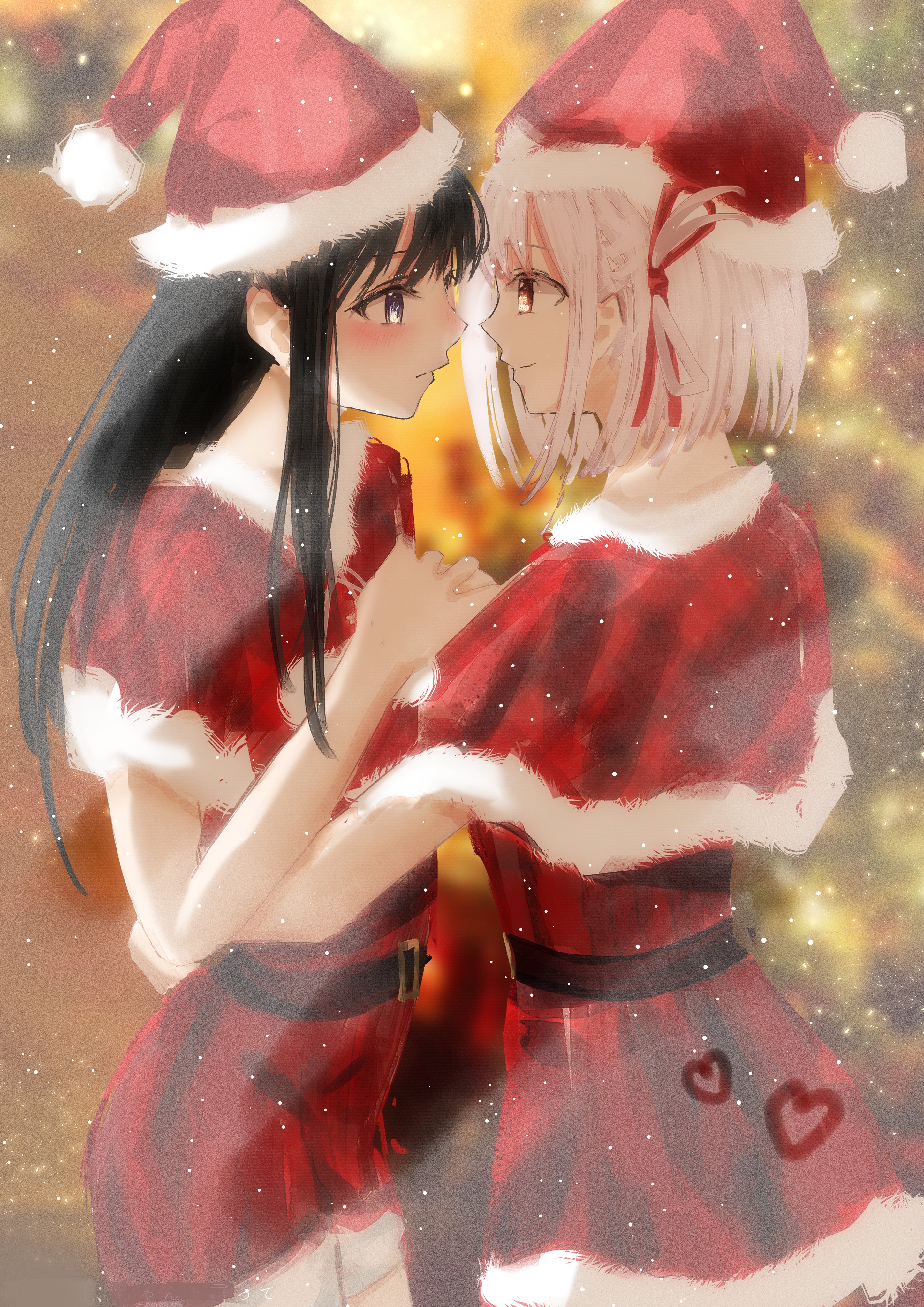 2girls absurdres bad_id bad_twitter_id black_hair blonde_hair blurry blurry_foreground christmas_tree dress hair_ribbon hat highres inoue_takina long_hair looking_at_another lycoris_recoil multiple_girls nishikigi_chisato obake_(amimonoobake) purple_eyes red_eyes ribbon santa_costume santa_dress santa_hat