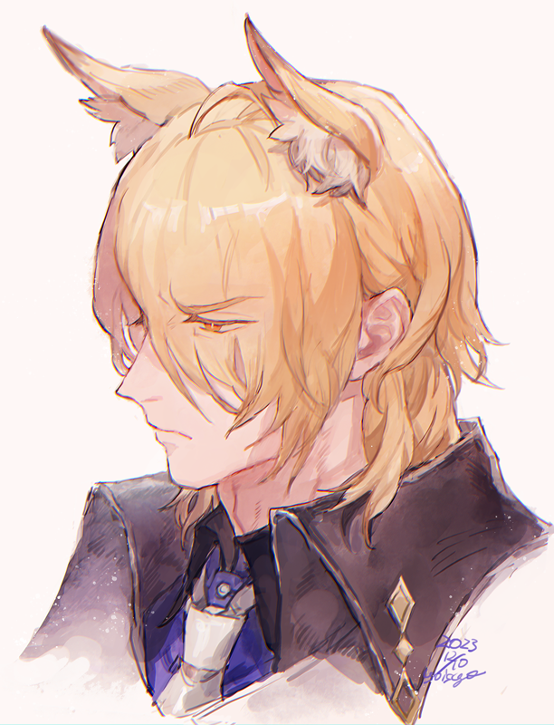 1boy animal_ear_fluff animal_ears arknights black_coat blonde_hair blue_shirt coat collared_shirt cropped_head dated eyes_visible_through_hair frown hair_over_one_eye horse_boy horse_ears looking_to_the_side male_focus mlynar_(arknights) necktie oisyox72 orange_eyes portrait shirt short_hair signature solo white_necktie