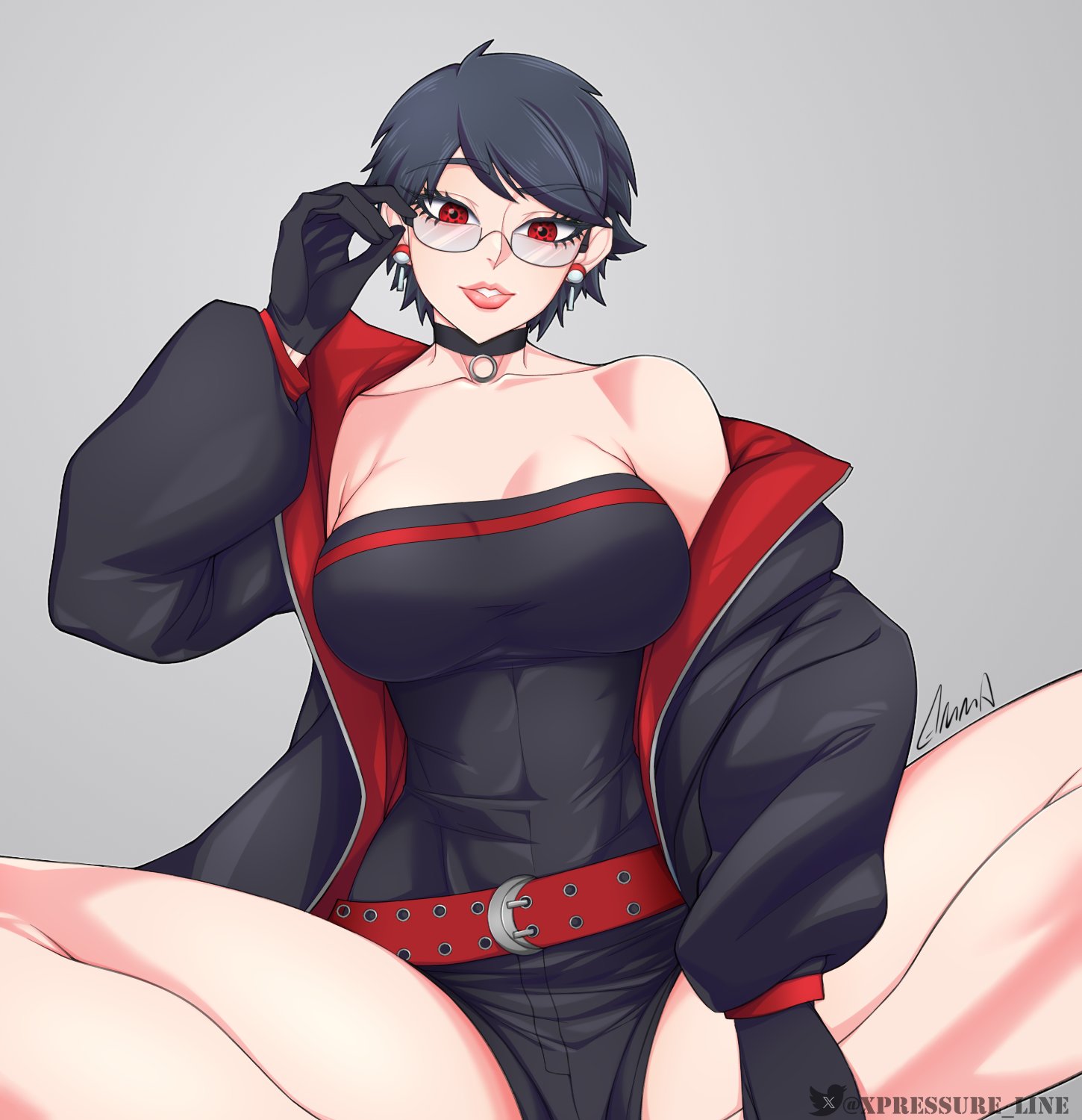 1girl black_hair black_jacket boruto:_two_blue_vortex choker emma_pressure glasses highres jacket mature_female naruto_(series) open_clothes open_jacket red_eyes sharingan short_hair short_shorts shorts solo spread_legs uchiha_sarada