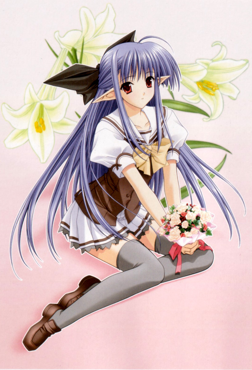 00s 1girl blue_hair bouquet female_focus flower half_updo highres long_hair nerine pointy_ears red_eyes school_uniform serafuku shuffle! solo suzuhira_hiro thighhighs
