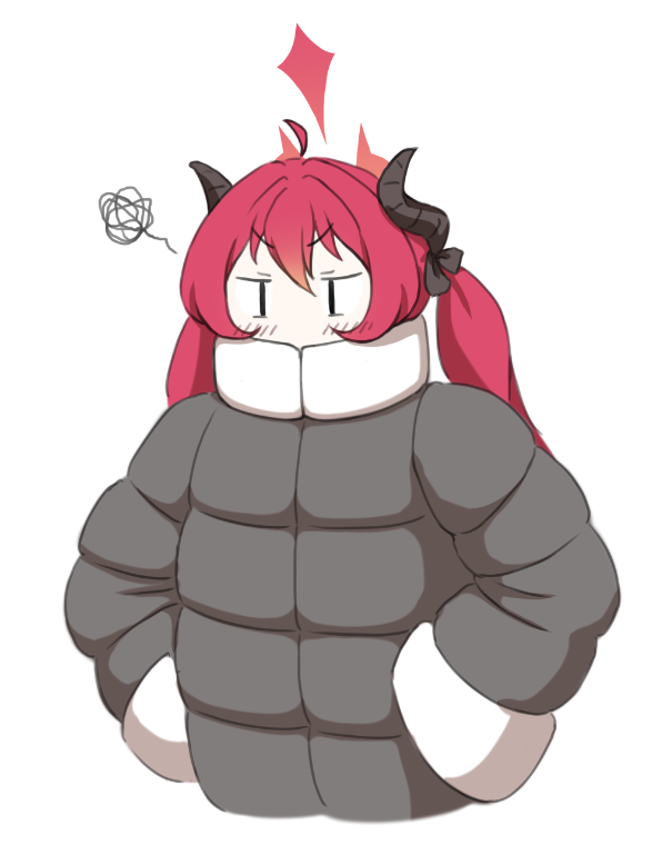 1girl ahoge blue_archive blush coat cropped_torso grey_coat halo hands_in_pockets horns hr.r jitome junko_(blue_archive) long_hair long_sleeves red_hair simple_background solo squiggle twintails upper_body v-shaped_eyebrows white_background winter_clothes winter_coat |_|