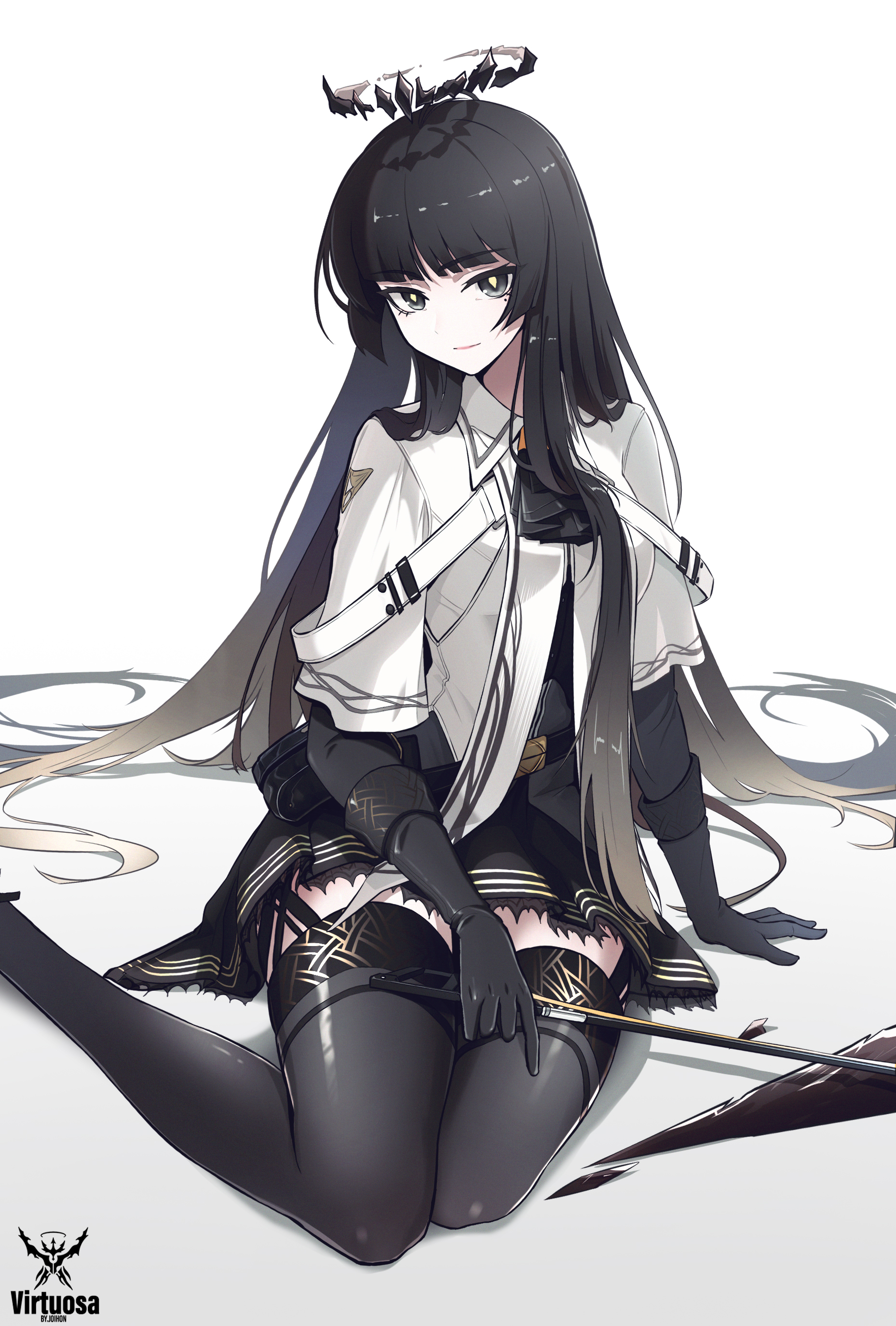 1girl absurdres arknights arm_on_thigh arm_rest arm_support artist_name ascot belt belt_buckle belt_pouch black_ascot black_belt black_bustier black_eyes black_garter_straps black_gloves black_hair black_halo black_skirt black_thighhighs blonde_hair blunt_bangs bow_(music) breasts broken_halo buckle bustier buttons character_name collared_jacket colored_inner_hair commentary dark_halo dress_shirt emblem film_grain foot_out_of_frame foreshortening garter_straps gloves gradient_background grey_hair grey_shirt hair_flowing_over hair_spread_out halo highres hime_cut holding holding_bow_(music) invisible_floor jacket joihon layered_sleeves lips lipstick logo long_hair long_sleeves looking_at_viewer makeup medium_breasts miniskirt mole mole_under_eye multicolored_hair pale_skin pink_lips pleated_skirt pouch shadow shards shiny_clothes shiny_legwear shirt short-sleeved_jacket short_over_long_sleeves short_sleeves sidelocks simple_background sitting sitting_sideways skirt solo straight_hair thighhighs thighs very_long_hair virtuosa_(arknights) white_background white_belt white_jacket wide_sleeves wing_collar yellow_pupils zettai_ryouiki