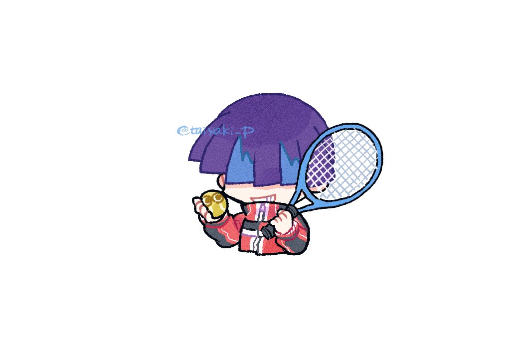 1boy ball bowl_cut cropped_torso doradorakingyo grin hair_over_eyes holding holding_ball holding_tennis_racket jacket male_focus purple_hair puyo_(puyopuyo) puyopuyo puyopuyo_7 puyopuyo_quest sasaki_maguro short_hair simple_background smile solo tennis_ball tennis_racket track_jacket twitter_username white_background