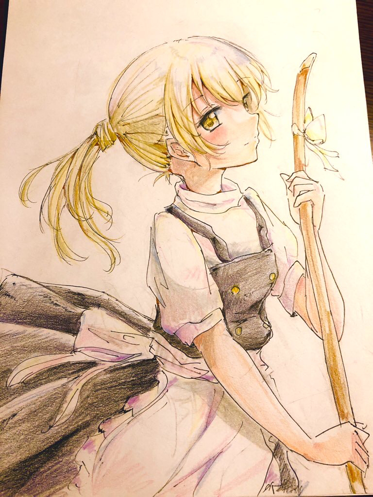 1girl alternate_hairstyle apron black_skirt black_vest blonde_hair broom buttons colored_pencil_(medium) holding holding_broom kirisame_marisa missing_headwear orya_422 ponytail puffy_short_sleeves puffy_sleeves shirt short_sleeves skirt skirt_set solo touhou traditional_media vest waist_apron white_apron white_shirt