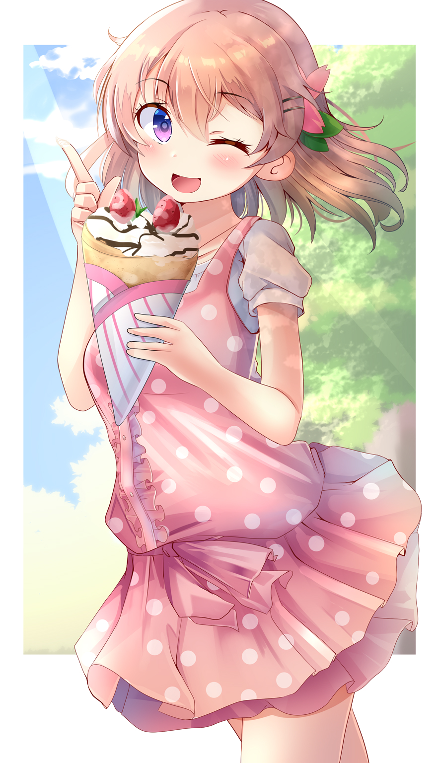 1girl ;d alternate_costume aru_(arudes) blush border casual center_frills commentary_request cowboy_shot crepe day dress eyelashes floating_hair food frills fruit gochuumon_wa_usagi_desu_ka? hair_between_eyes hair_ornament hairclip hands_up happy highres hoto_cocoa index_finger_raised looking_at_viewer medium_hair one_eye_closed open_mouth orange_hair outdoors pink_dress polka_dot polka_dot_dress puffy_short_sleeves puffy_sleeves purple_eyes shirt short_dress short_sleeves smile solo standing strawberry sunlight white_border white_shirt