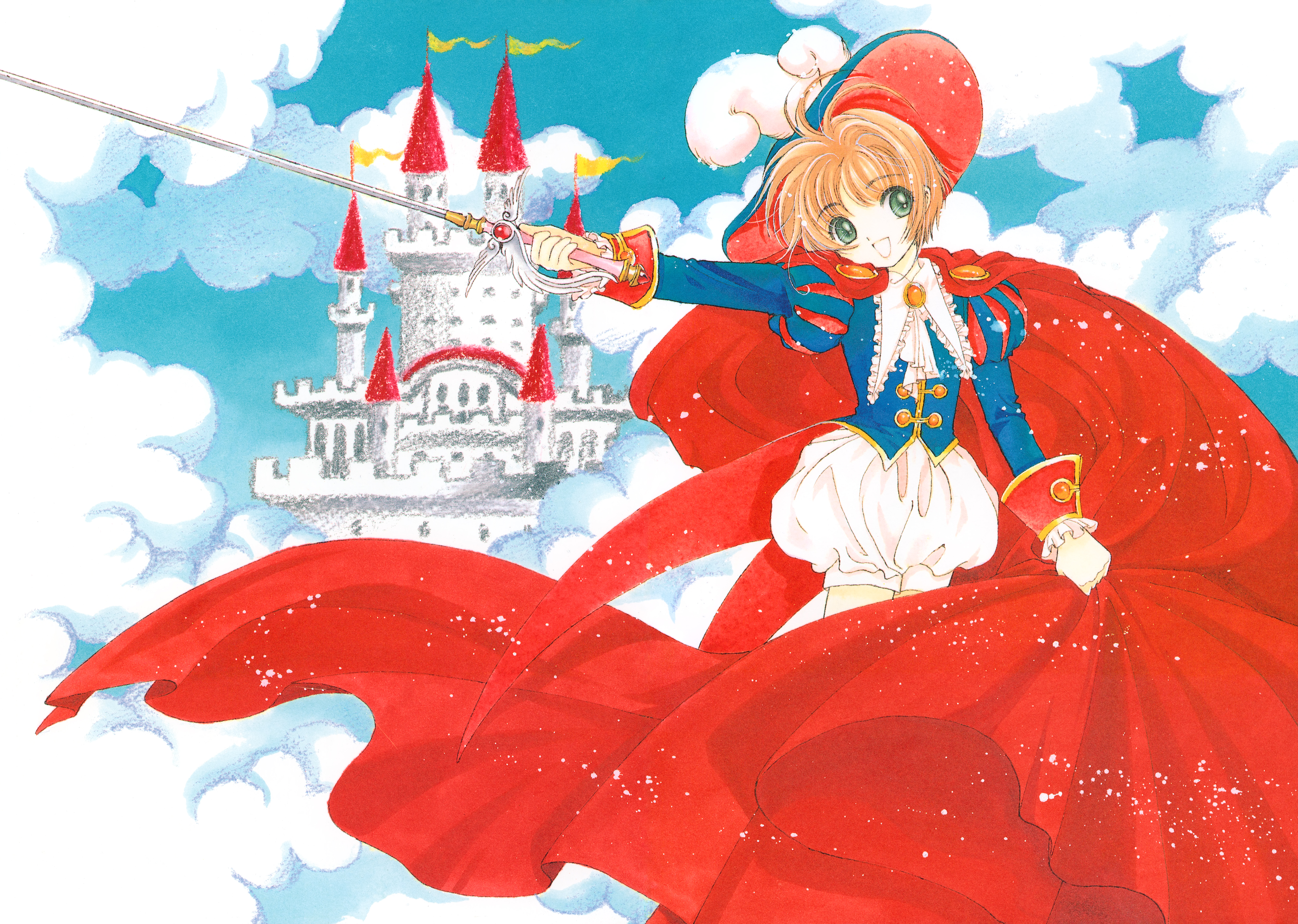 1girl absurdres brown_hair cape cardcaptor_sakura castle child clamp_(circle) cloud cloudy_sky green_eyes hat highres holding holding_sword holding_weapon kinomoto_sakura kinomoto_sakura_(sakura_prince) official_alternate_costume official_art red_cape scan short_hair sky solo standing sword weapon
