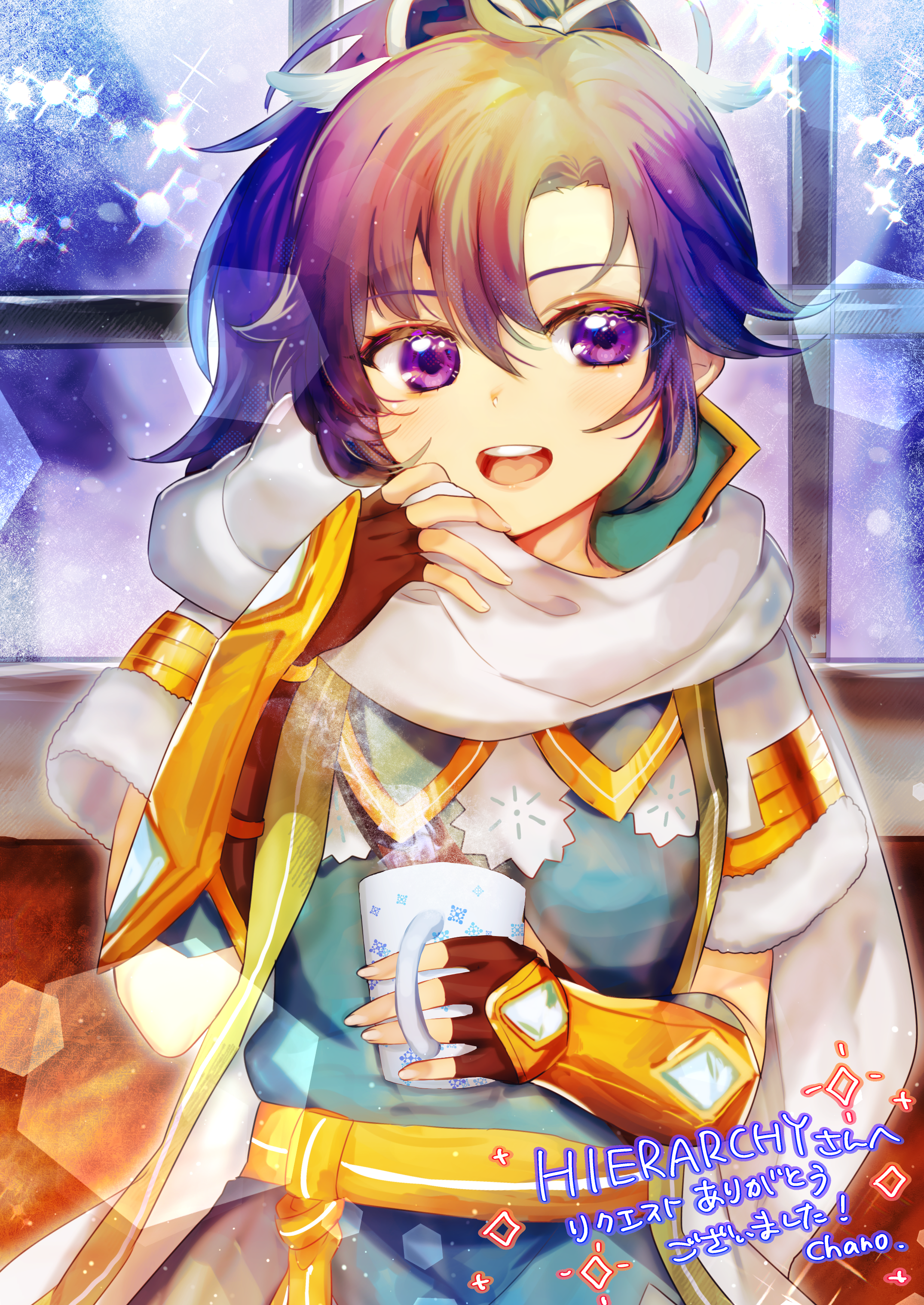 1girl absurdres blush chano_(22chano_death) cup fir_(fire_emblem) fire_emblem fire_emblem:_the_binding_blade highres hot_chocolate nintendo open_mouth ponytail purple_eyes purple_hair smile solo