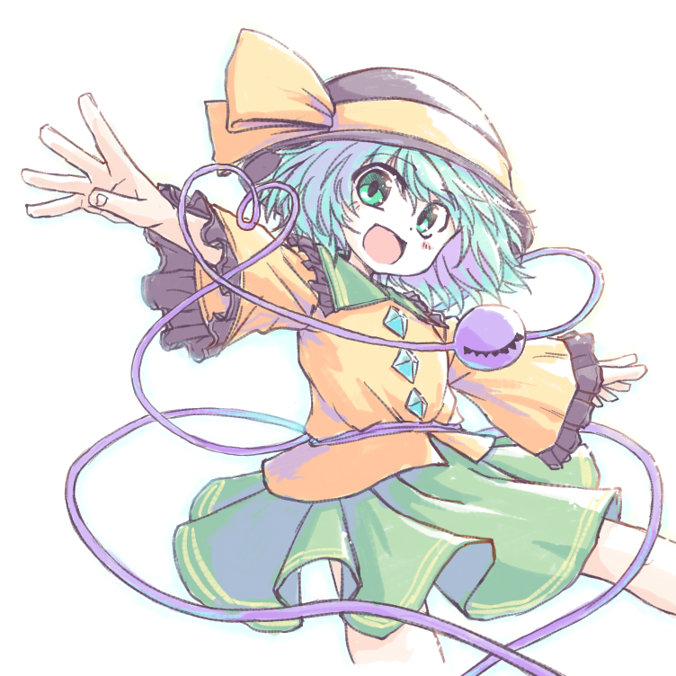 1girl aokukou black_hat bow buttons collar commentary diamond_button dot_nose frilled_collar frilled_sleeves frills from_side green_collar green_eyes green_hair green_skirt hat hat_bow heart heart_of_string komeiji_koishi light_blush long_sleeves looking_at_viewer open_mouth shirt short_hair simple_background skirt smile solo t-pose third_eye touhou white_background wide_sleeves yellow_bow yellow_shirt