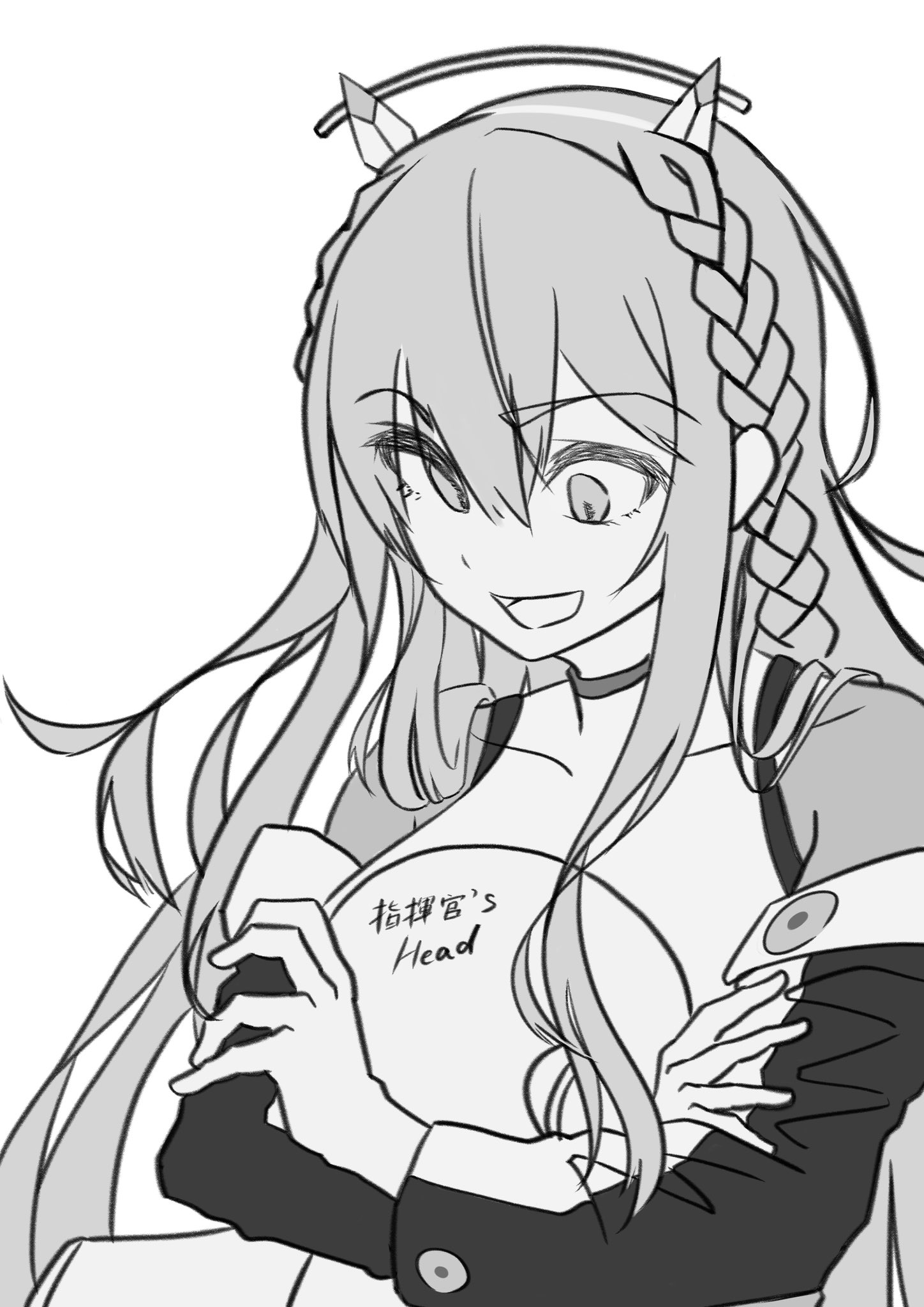 1boy 1girl :d bodysuit braid commander_(nikke) eri_aki0827 goddess_of_victory:_nikke greyscale headgear highres hug jacket long_hair monochrome off_shoulder open_mouth smile tove_(nikke) upper_body