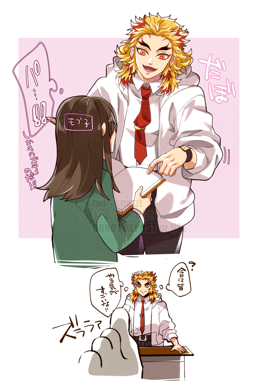 1boy 1girl blonde_hair brown_hair forked_eyebrows highres hood hooded_jacket jacket kimetsu_gakuen kimetsu_no_yaiba kina_izu long_hair long_sleeves male_focus multicolored_hair necktie open_mouth orange_eyes red_hair red_necktie rengoku_kyoujurou school_uniform translation_request white_hood yellow_eyes