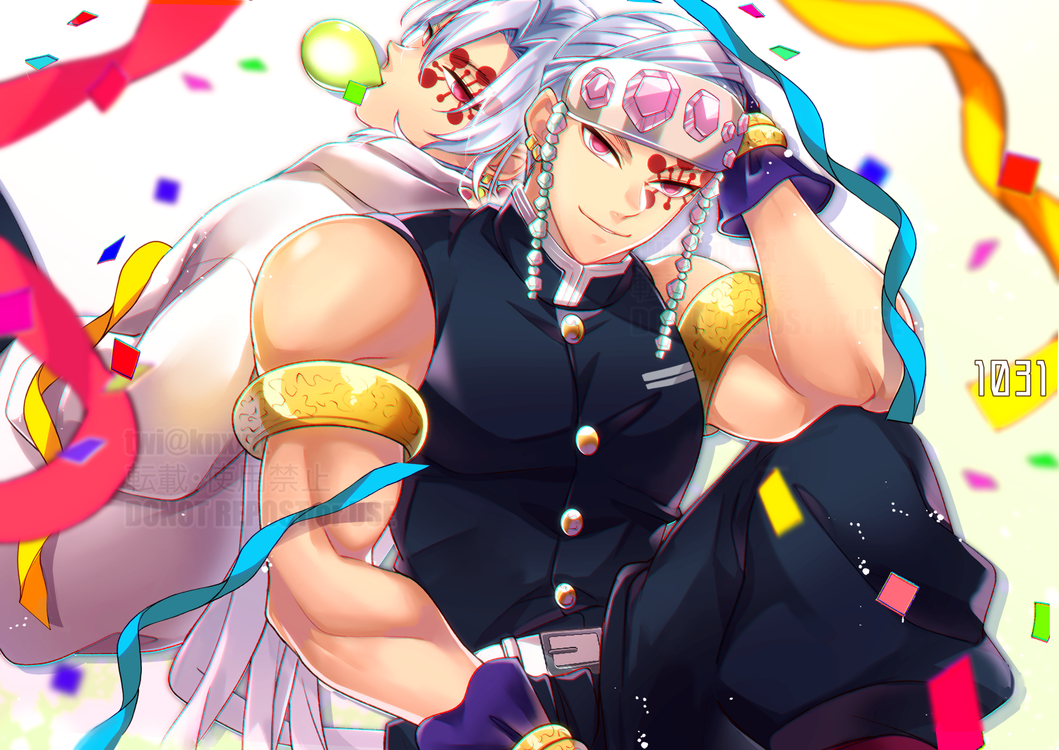 2boys demon_slayer_uniform facial_mark headband japanese_clothes jewelry kimetsu_gakuen kimetsu_no_yaiba kina_izu long_hair male_focus multiple_boys muscular muscular_male red_eyes smile uzui_tengen white_hair white_hood