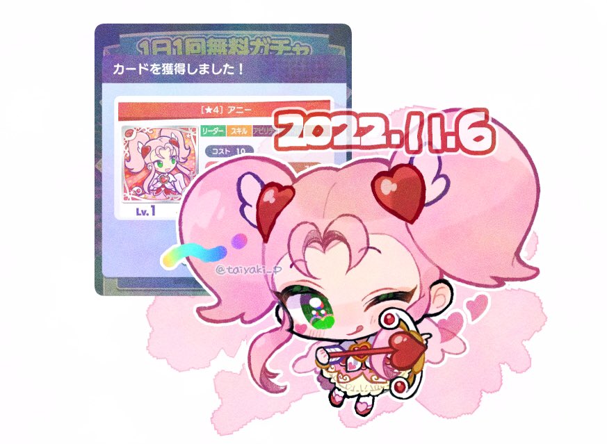 1girl annie_(puyopuyo) arrow_(projectile) blush bow_(weapon) chibi cupid dated doradorakingyo drawing_bow dress footwear_ornament game_screenshot_inset green_eyes hair_ornament heart heart_arrow heart_hair_ornament holding holding_bow_(weapon) holding_weapon licking_lips long_hair one_eye_closed pink_dress pink_wings puyopuyo puyopuyo_quest solo tongue tongue_out twintails twitter_username weapon white_background wings