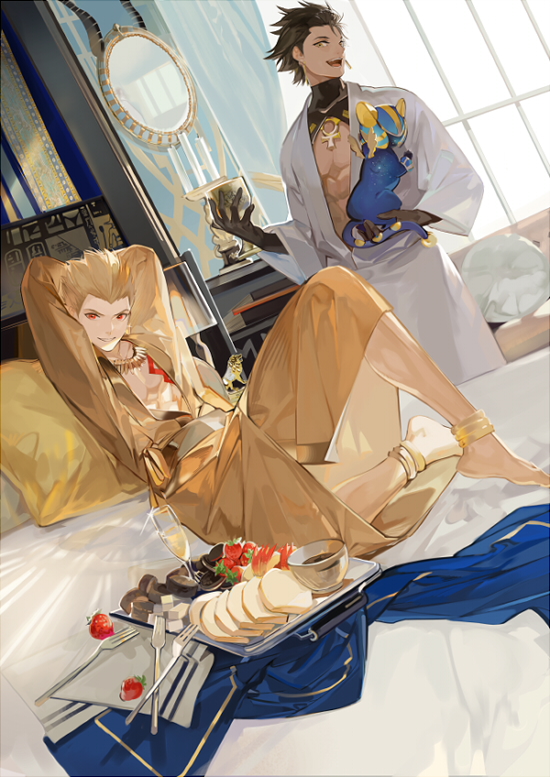 2boys :d abs alcohol animal anklet apple apple_rabbit arms_behind_head barefoot bathrobe black_gloves black_hair blanket blonde_hair bread bread_slice candelabra candle candlestand chalice champagne champagne_flute chocolate coffee cowboy_shot cup curtains cushion dark-skinned_male dark_skin day drinking_glass fate/grand_order fate_(series) food food_art fork fruit full_body gilgamesh_(fate) gloves gold_necklace hair_slicked_back holding holding_animal holding_cup hotel_room indoors jewelry lion_cub male_focus mirror multiple_boys napkin necklace nineo official_art on_bed open_mouth ozymandias_(fate) parted_lips pillow reclining red_eyes short_hair shrug_(clothing) smile spiked_hair standing strawberry toast toned toned_male tray v-shaped_eyebrows window yellow_eyes