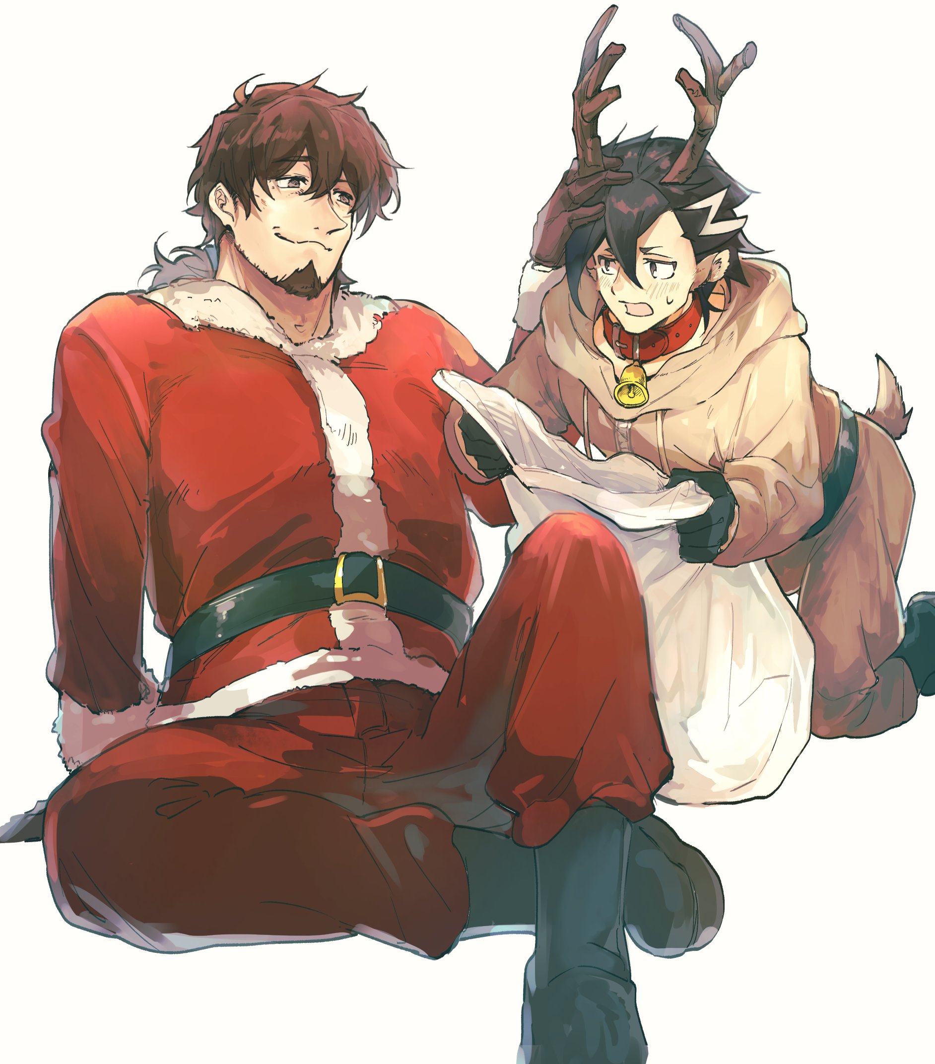 2boys animal_costume bell belt black_belt black_eyes black_footwear black_gloves black_hair blush brown_eyes brown_gloves brown_hair closed_mouth collar facial_hair fake_antlers fake_tail fate/grand_order fate_(series) gloves goatee hand_on_another's_head hector_(fate) highres holding holding_sack kneeling male_focus mandricardo_(fate) multicolored_hair multiple_boys neck_bell ponytail red_collar reindeer_costume sack santa_costume simple_background sitting smile streaked_hair sweatdrop tail tumikilondon5 white_background