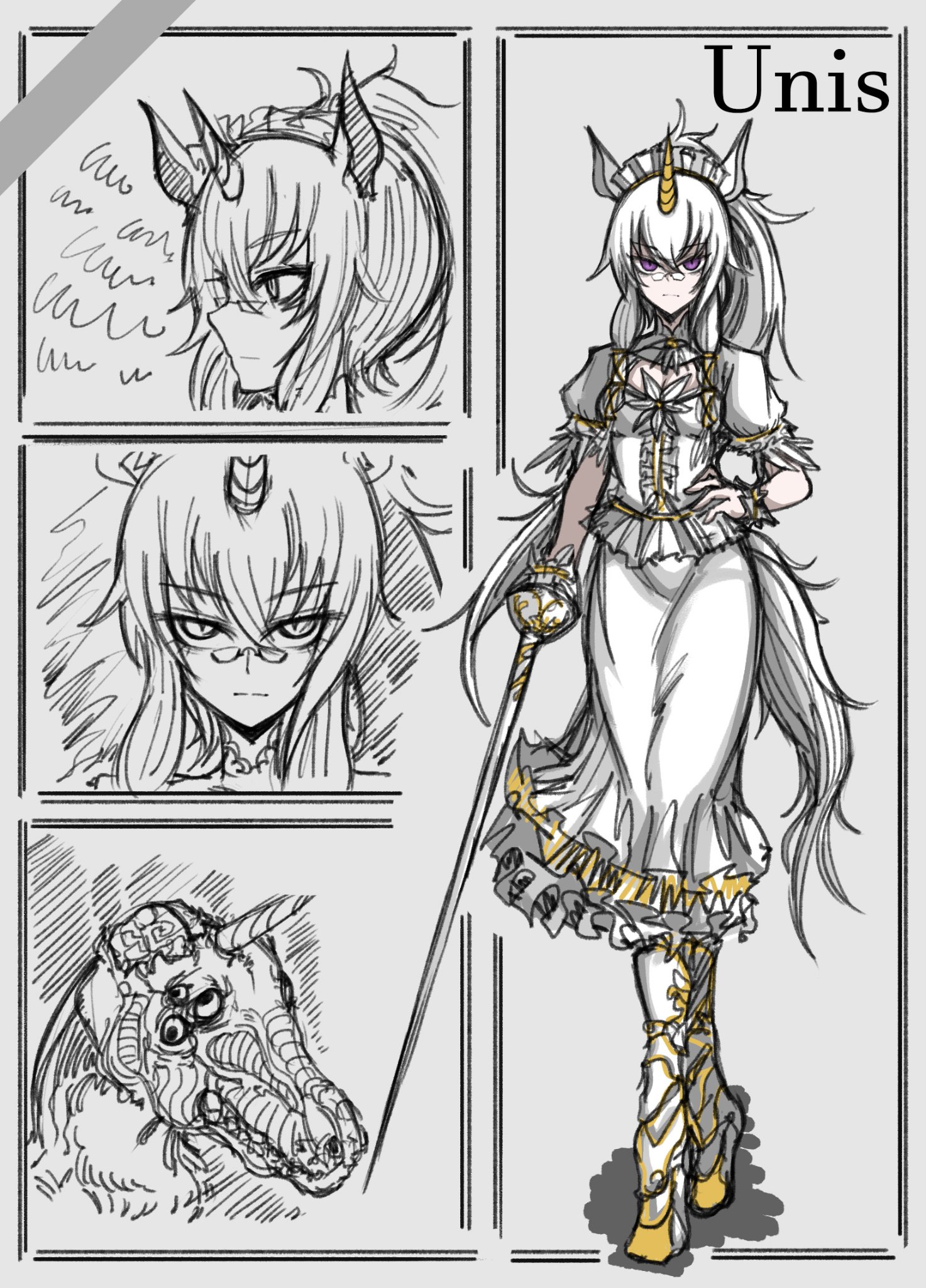 1girl animal_ears armored_boots black_souls boots character_name closed_mouth dress dress_flower flower frilled_dress frills full_body glasses gloves grey_background hair_between_eyes hand_on_own_hip highres horns horse_ears koshou_shou_mitsu long_hair multiple_views ponytail puffy_short_sleeves puffy_sleeves purple_eyes rapier serious short_sleeves simple_background single_horn sketch sword unicorn_girl unis_(black_souls) weapon white_dress white_flower white_footwear white_gloves white_hair yellow_horns