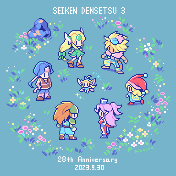 3boys 4girls angela_(seiken_densetsu_3) anniversary armor blonde_hair blue_background blue_hair blue_hat brown_footwear brown_tunic charlotte_(seiken_densetsu_3) copyright_name dated dress duran_(seiken_densetsu_3) faerie_(seiken_densetsu_3) fairy green_dress hat hawkeye_(seiken_densetsu_3) headgear hiroita jester kevin_(seiken_densetsu_3) long_hair multiple_boys multiple_girls orange_hair pink_hair pixel_art pointy_ears ponytail red_hat riesz seiken_densetsu seiken_densetsu_3 tunic