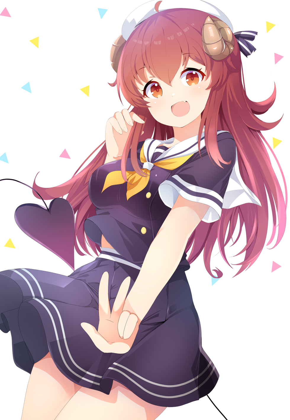 1girl 2023 :d ahoge alternate_costume aru_(arudes) beret black_serafuku black_skirt blush breasts brown_eyes brown_hair commentary_request confetti cowboy_shot dated_commentary demon_girl demon_horns demon_tail fang floating_clothes floating_hair hair_between_eyes hand_up happy hat high-waist_skirt highres horns long_hair looking_at_viewer machikado_mazoku medium_breasts open_mouth outstretched_arm sailor_collar school_uniform serafuku short_sleeves sidelocks simple_background skin_fang skirt smile solo standing tail w white_background white_hat white_sailor_collar yoshida_yuuko