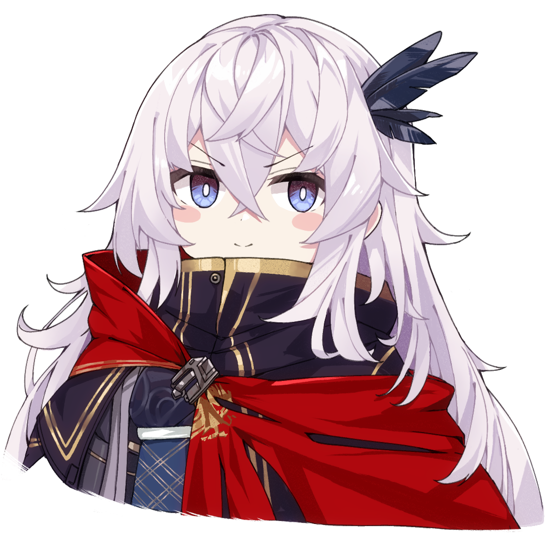 1girl blue_eyes blush_stickers cape cloak fate/grand_order fate_(series) feather_hair_ornament feathers grey_hair hair_ornament hururu_(vldptmxk1054) long_hair red_cape saika_magoichi_(fate) smile white_background