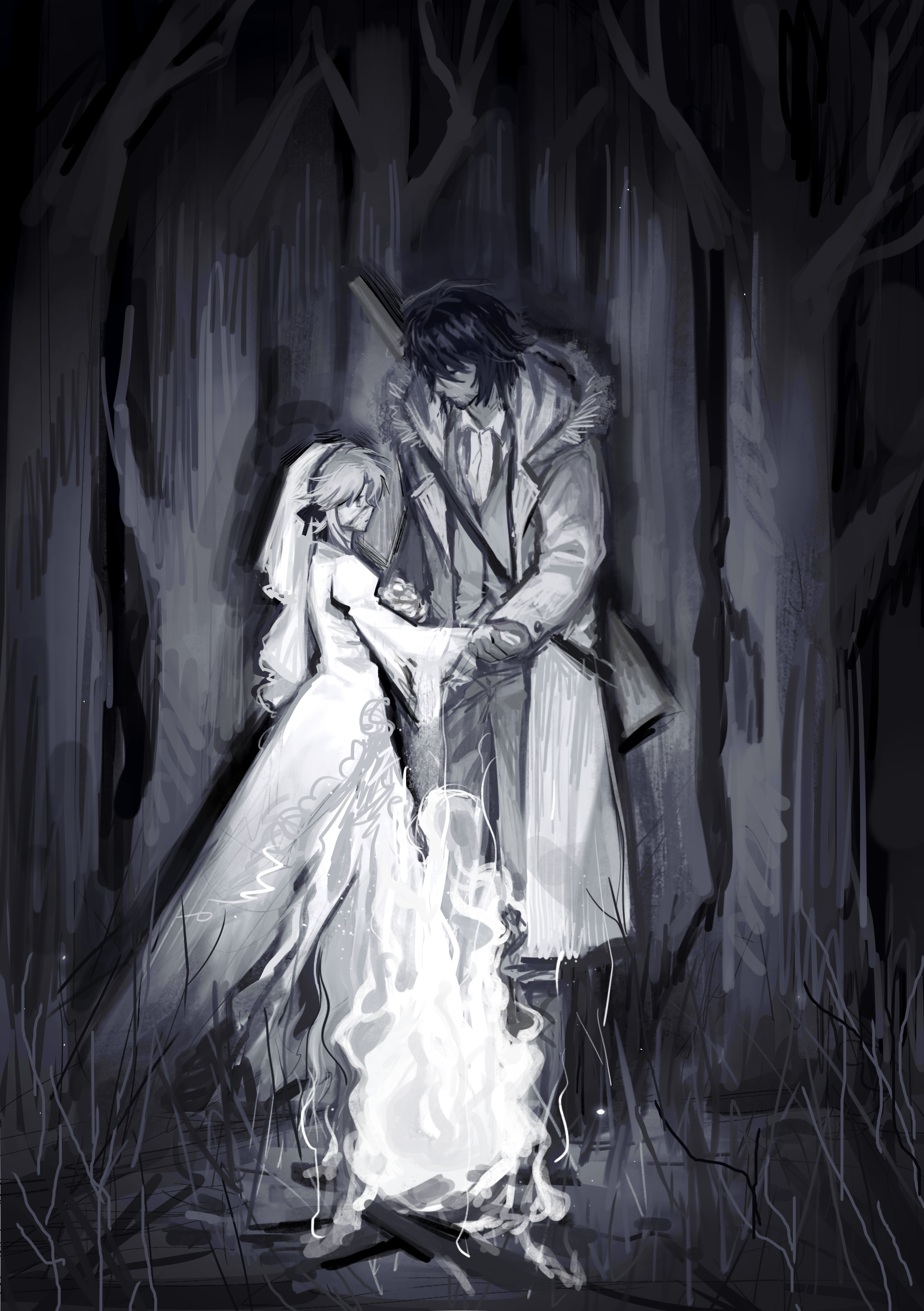 1boy 1other absurdres bonfire bow bridal_veil coat dark_background degrees_of_lewdity dress eden_(degrees_of_lewdity) eden_(male)_(degrees_of_lewdity) fire forest gloves grass greyscale gun gun_on_back hair_bow height_difference highres holding_hands long_sleeves looking_at_another monochrome nature outdoors player_character_(degrees_of_lewdity) player_character_(female)_(degrees_of_lewdity) rifle standing veil vitaminc81 weapon weapon_on_back wedding wedding_dress white_dress