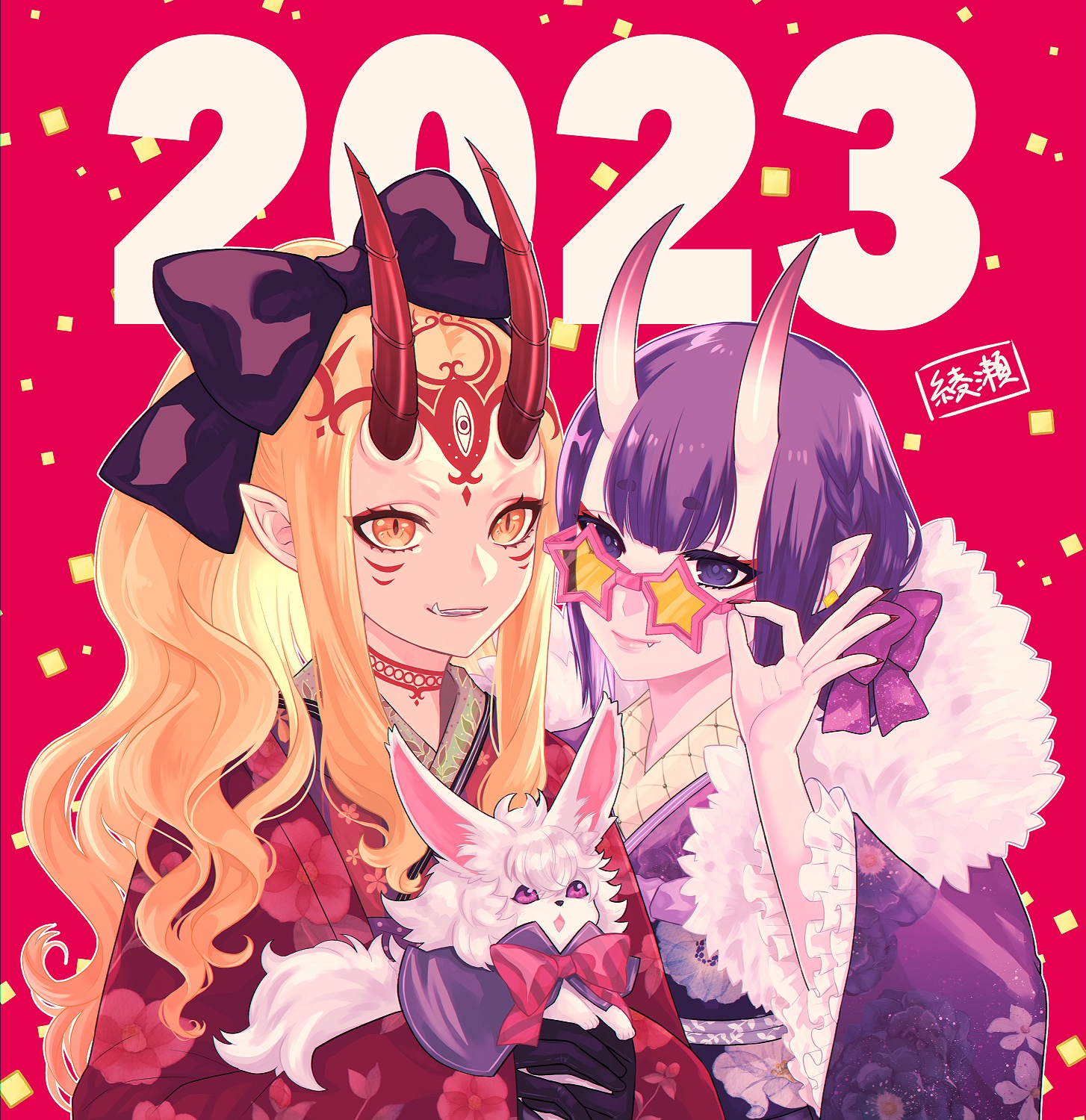 2023 2girls adjusting_eyewear black_bow black_gloves blonde_hair bow commentary_request creature earrings facial_mark fang fate/grand_order fate_(series) floral_print forehead_mark fou_(fate) frilled_sleeves frills fur_collar gloves hair_bow highres hizuki_aya horns ibaraki_douji_(fate) japanese_clothes jewelry kimono long_hair looking_at_viewer multiple_girls new_year oni pointy_ears purple_eyes purple_hair purple_kimono red_kimono short_hair shuten_douji_(fate) skin-covered_horns smile star-shaped_eyewear star_(symbol) stud_earrings sunglasses upper_body yellow_eyes