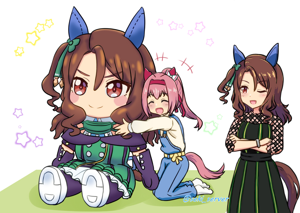 2girls animal_ears brown_hair character_doll commentary_request crossed_arms doll doqute_stuffed_doll dress ear_covers haru_urara_(umamusume) high_ponytail horse_ears horse_girl horse_tail king_halo_(casual)_(umamusume) king_halo_(king_of_emeralds)_(umamusume) king_halo_(umamusume) multiple_girls pink_hair ponytail seki_(hyokosho) smile striped_clothes striped_dress stuffed_toy tail twitter_username umamusume