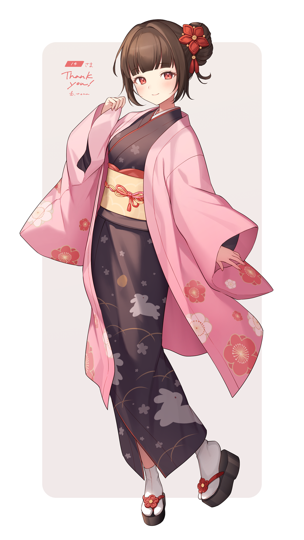 1girl black_kimono blunt_bangs brown_hair closed_mouth commission english_text floral_print full_body hair_bun haori highres japanese_clothes kimono long_sleeves looking_at_viewer obi obiage obijime okobo original platform_sandals red_eyes sandals sash second-party_source short_hair smile solo standing tabi toma_(norishio)