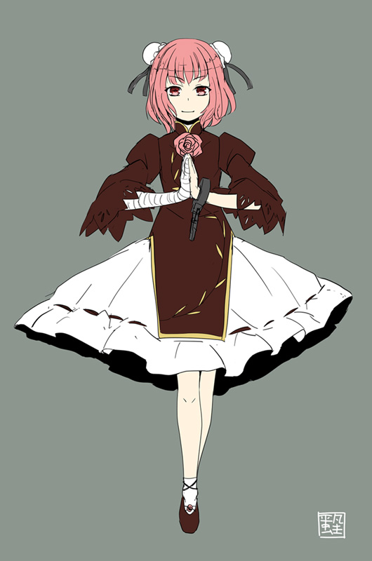 1girl bandaged_arm bandages bun_cover closed_mouth commentary_request cuffs double_bun flower full_body grey_background hair_bun heibonkaeru ibaraki_kasen juliet_sleeves long_sleeves looking_at_viewer own_hands_clasped own_hands_together pink_flower pink_hair puffy_sleeves ribbon-trimmed_skirt ribbon_trim shackles short_hair simple_background skirt solo tabard touhou white_skirt