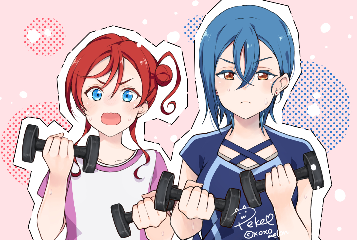 2girls blue_eyes blue_hair blue_shirt brown_eyes dumbbell hair_between_eyes hair_bun holding holding_dumbbell looking_at_viewer love_live! love_live!_superstar!! medium_hair multiple_girls open_mouth outline peke_(xoxo_melon) purple_shirt red_hair shirt short_hair short_sleeves single_side_bun sweat upper_body v-shaped_eyebrows wakana_shiki wavy_mouth white_outline yoneme_mei