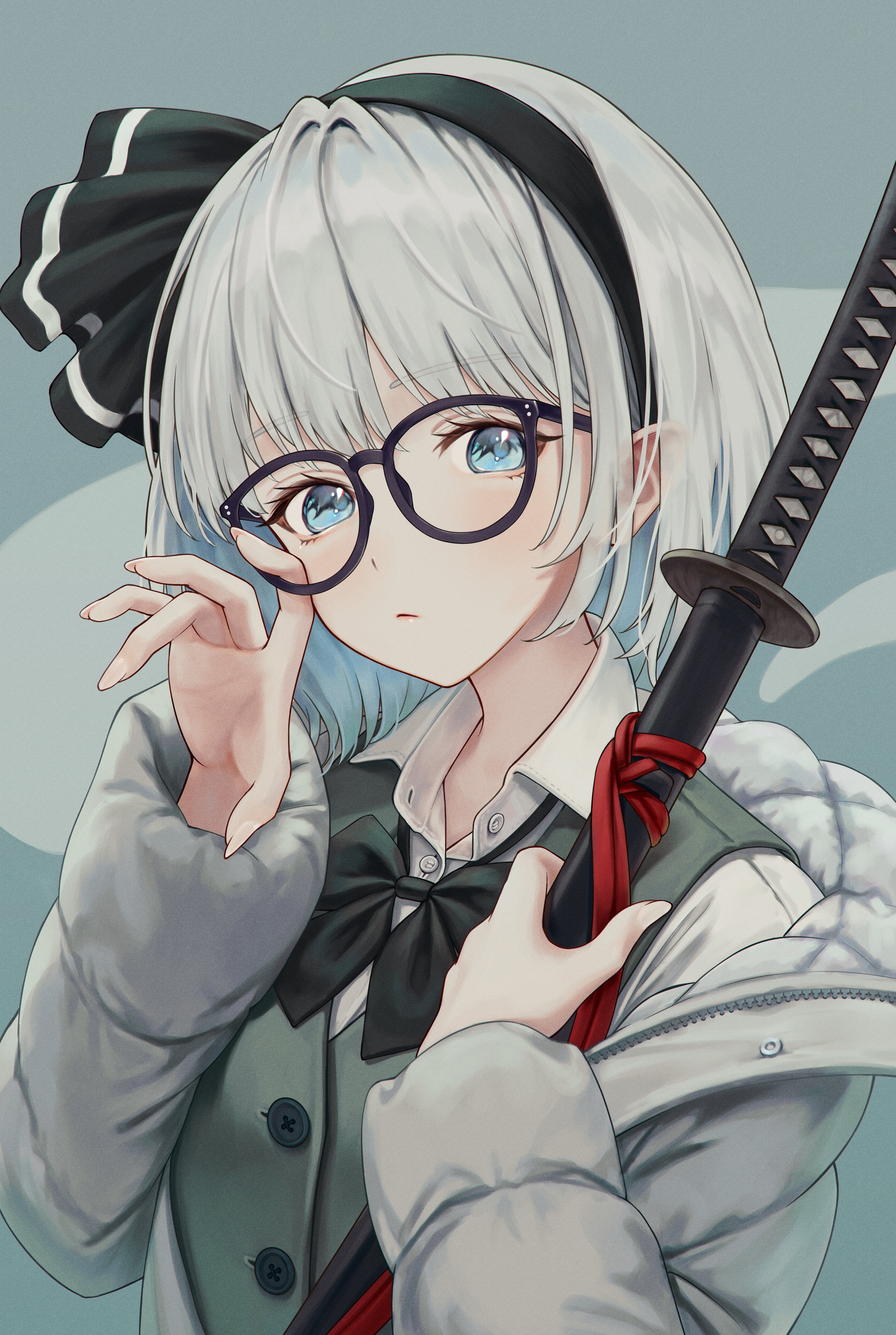 1girl absurdres black-framed_eyewear black_bow black_bowtie black_hairband blue_background blue_eyes bow bowtie coat glasses green_jacket hairband highres jacket konpaku_youmu konpaku_youmu_(ghost) shirt short_hair solo sword torinari_(dtvisu) touhou weapon white_hair white_jacket white_shirt winter_clothes winter_coat