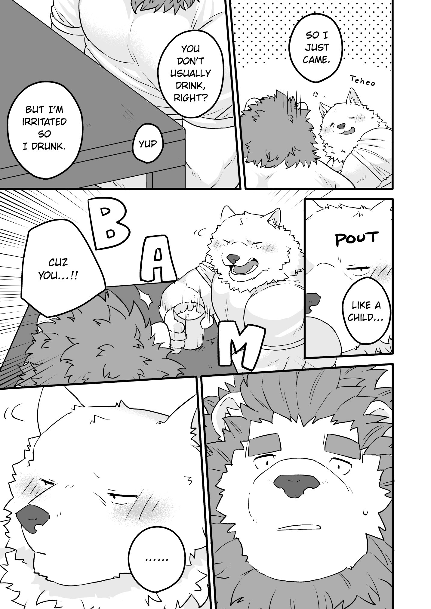 2boys averting_eyes bara bear_boy blush couple cup drunk english_text furry furry_male furry_with_furry gou_(nogitu) greyscale highres holding holding_cup huge_eyebrows large_pectorals lion_boy lion_mane male_focus mature_male monochrome multiple_boys muscular muscular_male nogitu on_table original pectorals pout roku_(nogitu) sanpaku short_hair shy squeans table tsundere turn_pale yaoi