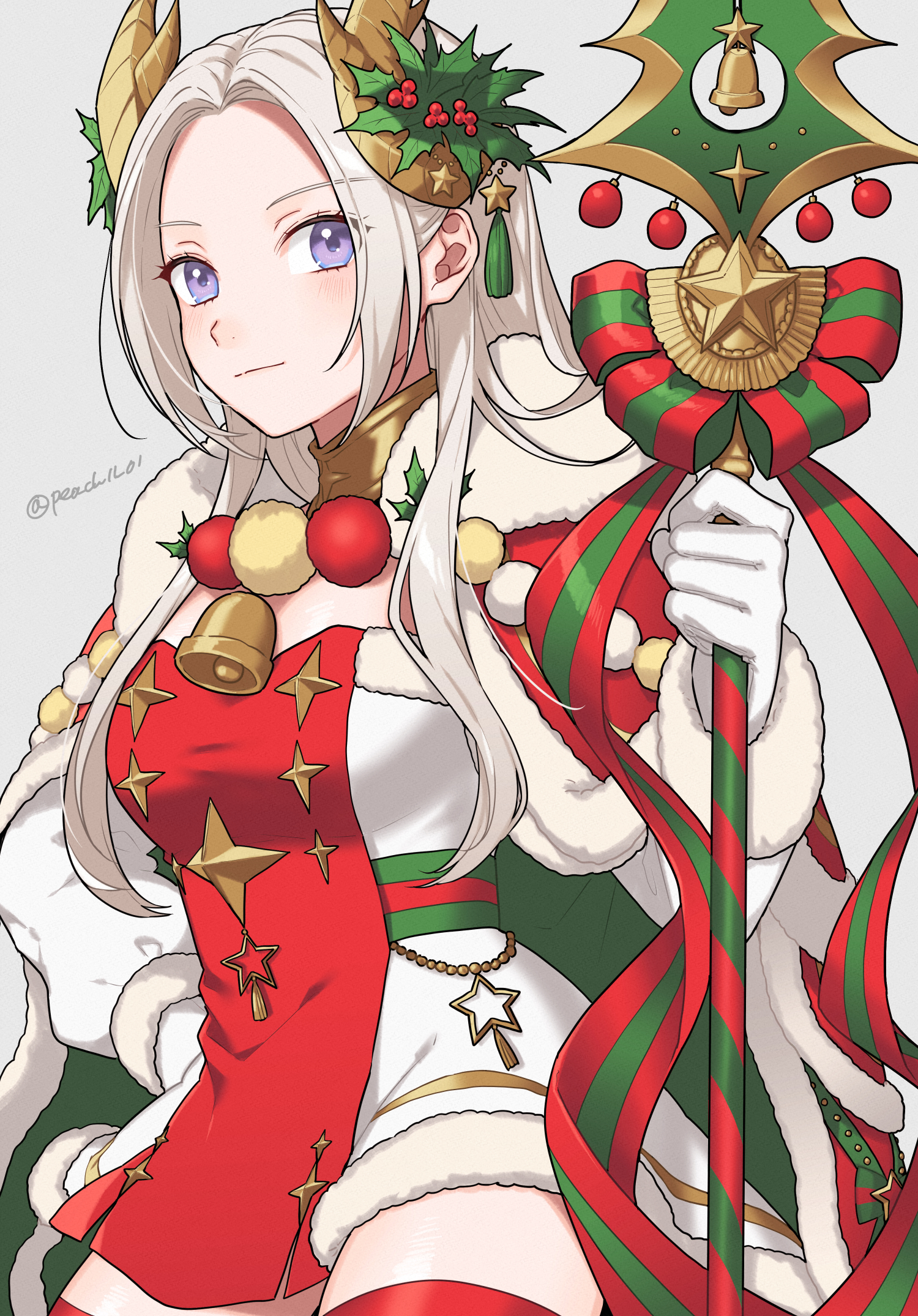 1girl blue_eyes cape dress edelgard_von_hresvelg edelgard_von_hresvelg_(snowfall_future) fake_horns fire_emblem fire_emblem:_three_houses fire_emblem_heroes gloves hair_ornament highres holding holding_polearm holding_weapon horns long_hair long_sleeves looking_at_viewer multicolored_clothes nintendo official_alternate_costume polearm purple_eyes red_cape red_dress red_thighhighs shamu_(peach11_01) smile solo thighhighs weapon white_dress white_gloves white_hair