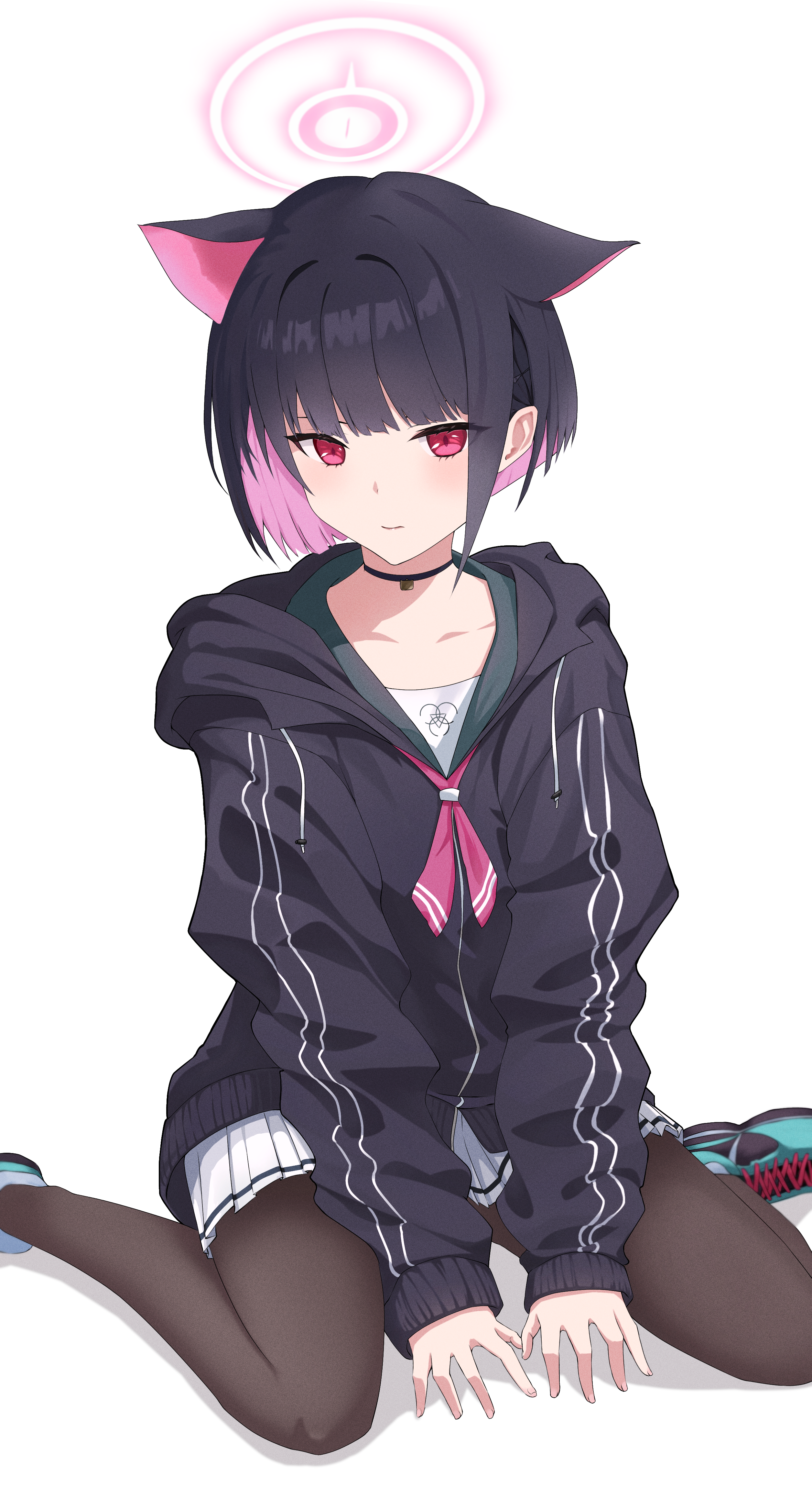 1girl absurdres animal_ears black_choker black_hair black_hoodie black_pantyhose blue_archive blue_sailor_collar cat_ears choker closed_mouth colored_inner_hair commentary_request drawstring green_shoes halo highres hikkio hood hood_down hoodie kazusa_(blue_archive) long_sleeves looking_at_viewer multicolored_hair neckerchief pantyhose pink_hair pink_halo pink_neckerchief pleated_skirt red_eyes sailor_collar school_uniform serafuku shoes short_hair simple_background sitting skirt solo wariza white_background white_skirt