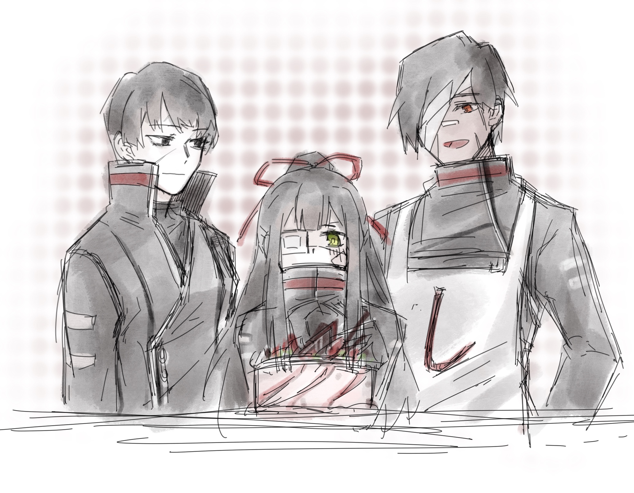 1boy 2girls apron black_eyes black_hair black_jacket cake closed_mouth food hair_ribbon half_updo highres jacket library_of_ruina long_hair maxwell_yaochu multiple_girls open_mouth project_moon red_ribbon ribbon shi_association_south_uniform sidelocks smile table tenma_(project_moon) upper_body valentin_(project_moon) very_long_hair yujin_(project_moon)