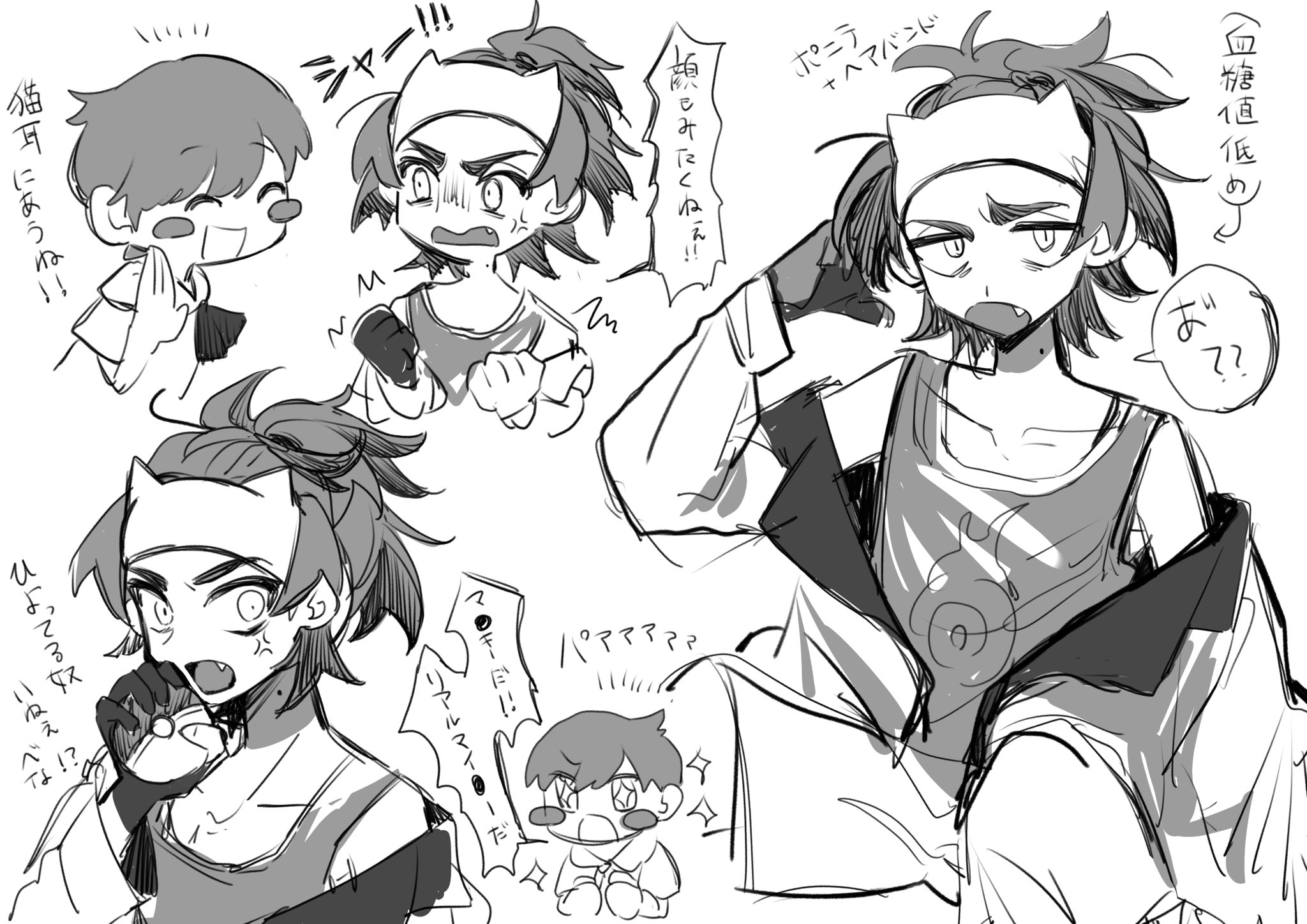 ! !! !? +_+ 2boys ? ?? anger_vein angry blush_stickers closed_eyes doodle fang florian_(pokemon) frown gloves greyscale hairband hand_to_own_mouth hand_up happy highres holding holding_poke_ball jacket kieran_(pokemon) long_sleeves looking_ahead looking_at_another looking_at_viewer male_focus mole mole_on_neck monochrome multiple_boys multiple_views nintendo off-shoulder_jacket off_shoulder open_mouth poke_ball pokemon pokemon_scarlet_and_violet raised_eyebrow shaded_face shirt short_sleeves shorts sitting sketch smile sparkle sparkling_eyes speech_bubble tank_top teeth tisanntisyou translation_request upper_body upper_teeth_only wide-eyed