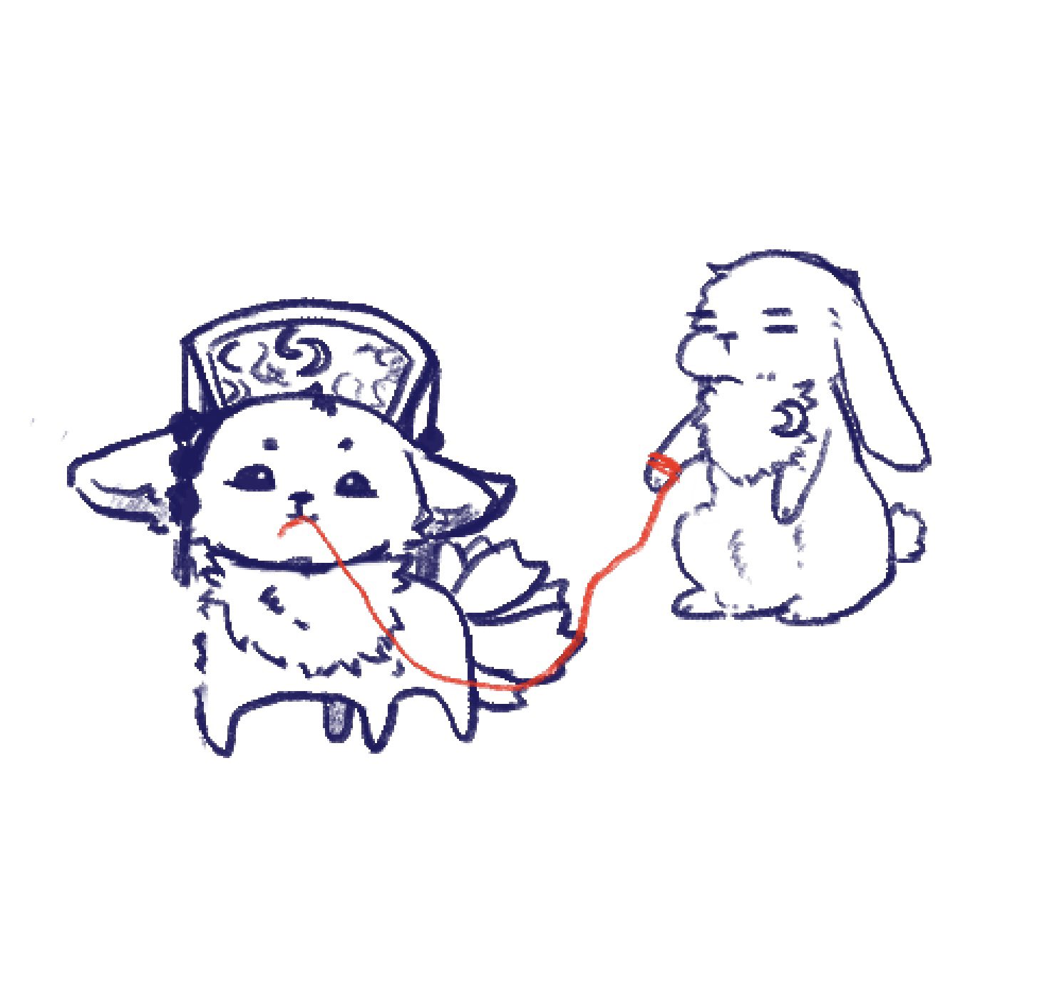 animal animal_focus animalization crescent crescent_pin fox highres junko_(touhou) junko_(touhou)_(fox) leash leash_in_mouth monochrome multiple_tails pet_walking phoenix_crown pom_pom_(clothes) rabbit reisen_udongein_inaba reisen_udongein_inaba_(bunny) shinsha_(xiaoxie76671511) sketch tail touhou white_background