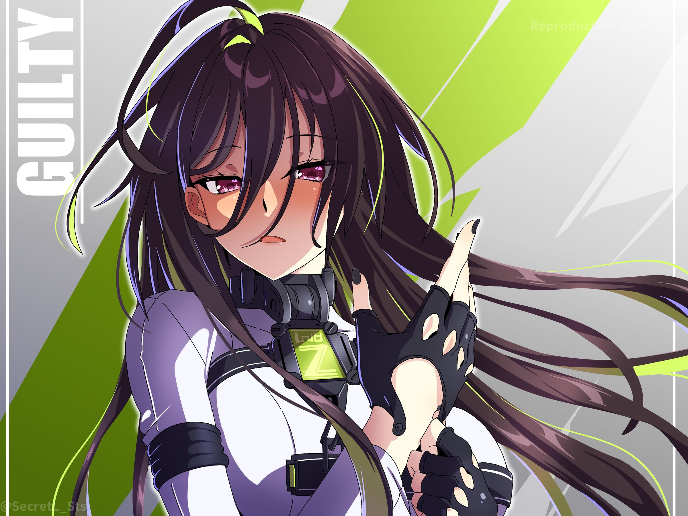 1girl black_gloves black_nails bodysuit breasts brown_hair character_name fingerless_gloves gloves goddess_of_victory:_nikke green_hair guilty_(nikke) highres large_breasts long_hair multicolored_hair pink_eyes sebunsu solo two-tone_hair upper_body very_long_hair white_bodysuit