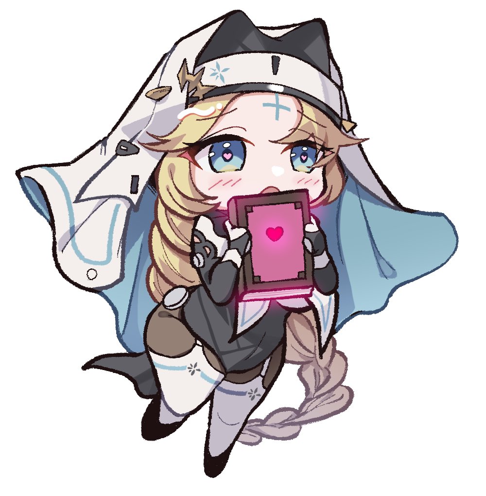 1girl :o black_robe blonde_hair blue_eyes blush bodystocking book braid chibi cross_tattoo facial_mark forehead_mark forehead_tattoo garter_straps goddess_of_victory:_nikke habit heart heart-shaped_pupils holding kyouhanechaou legwear_garter long_hair nun rapunzel_(nikke) robe simple_background solo symbol-shaped_pupils tattoo thighhighs veil very_long_hair white_robe white_thighhighs white_veil wide_hips yatanukikey